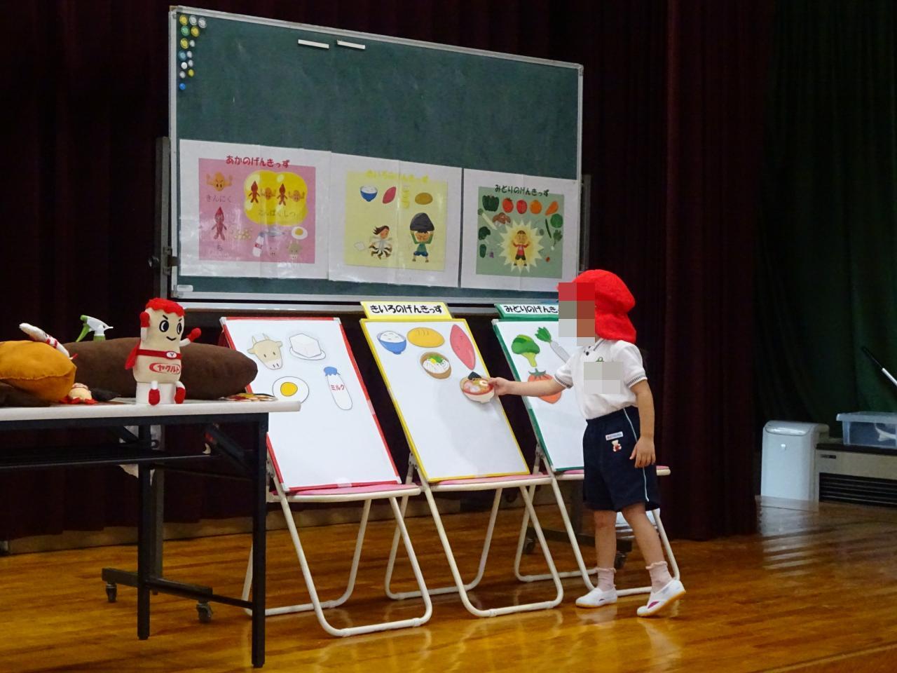 食材カードを使った年長さんの体験型クイズでは、あかのゲンキッズ、きいろのゲンキッズ、みどりのゲンキッズに分かれる食べ物を「うどんはどこかなぁ?」「トマトはどこかなぁ?」「さかなはどこかなぁ?」とみんなで考えながら分けて、答え合わせをすると、全問正解の子どもたちでした✨