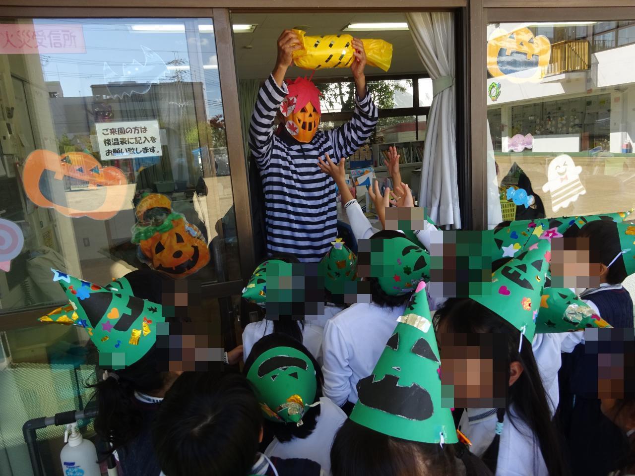 ハロウィンの仮装をした園長先生が大きなキャンディーをプレゼントしてくれました💝