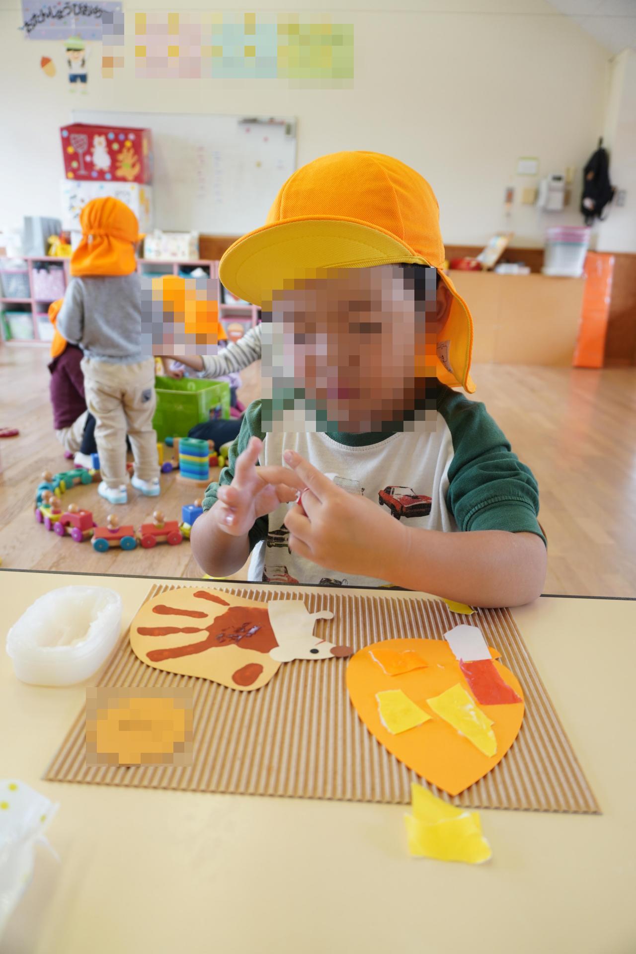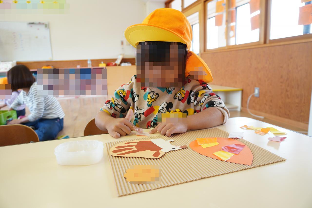 子どもたちなりに、季節の移り変わりや「秋」について理解を深め、それぞれかわいい作品が出来上がりました🐿