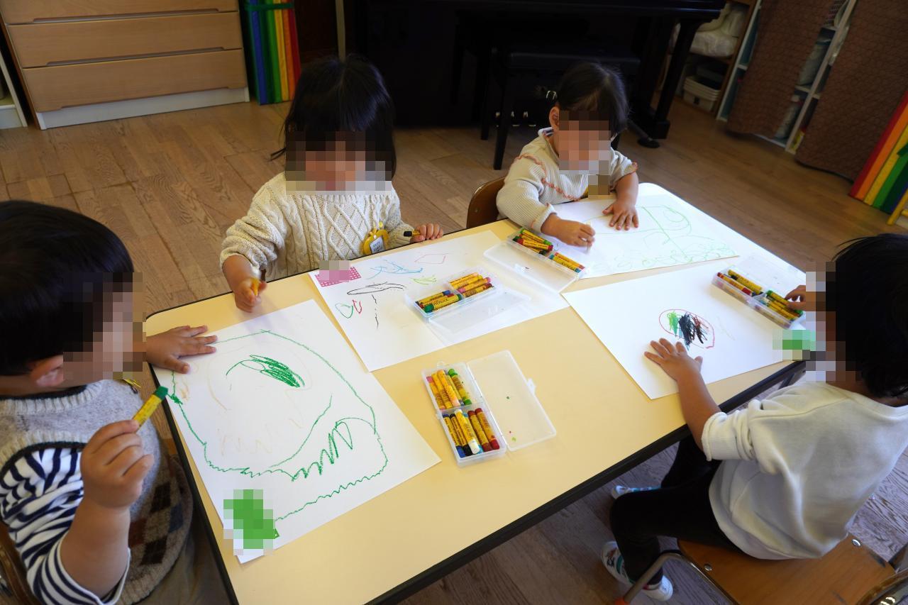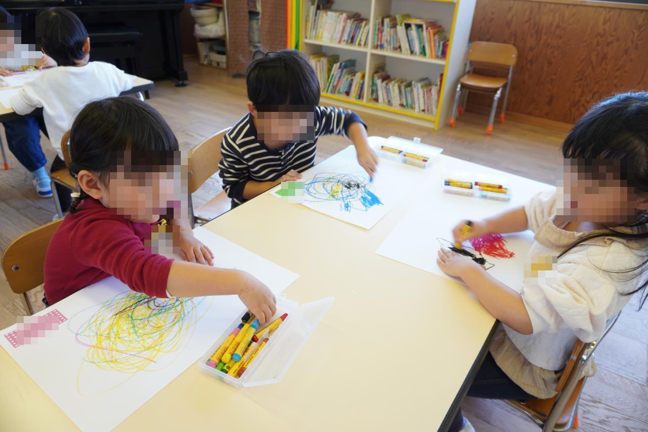 その後は初めてクレパス🖍を使ってのお絵描き遊びも行い、好きな色を選択して、楽しそうに描く子どもたちの姿が見られていました😄✨