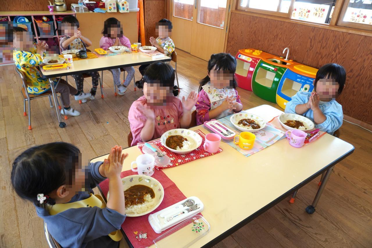 元気いっぱいにお昼ごはんの歌を歌って、「いただきまーす🙏💕」