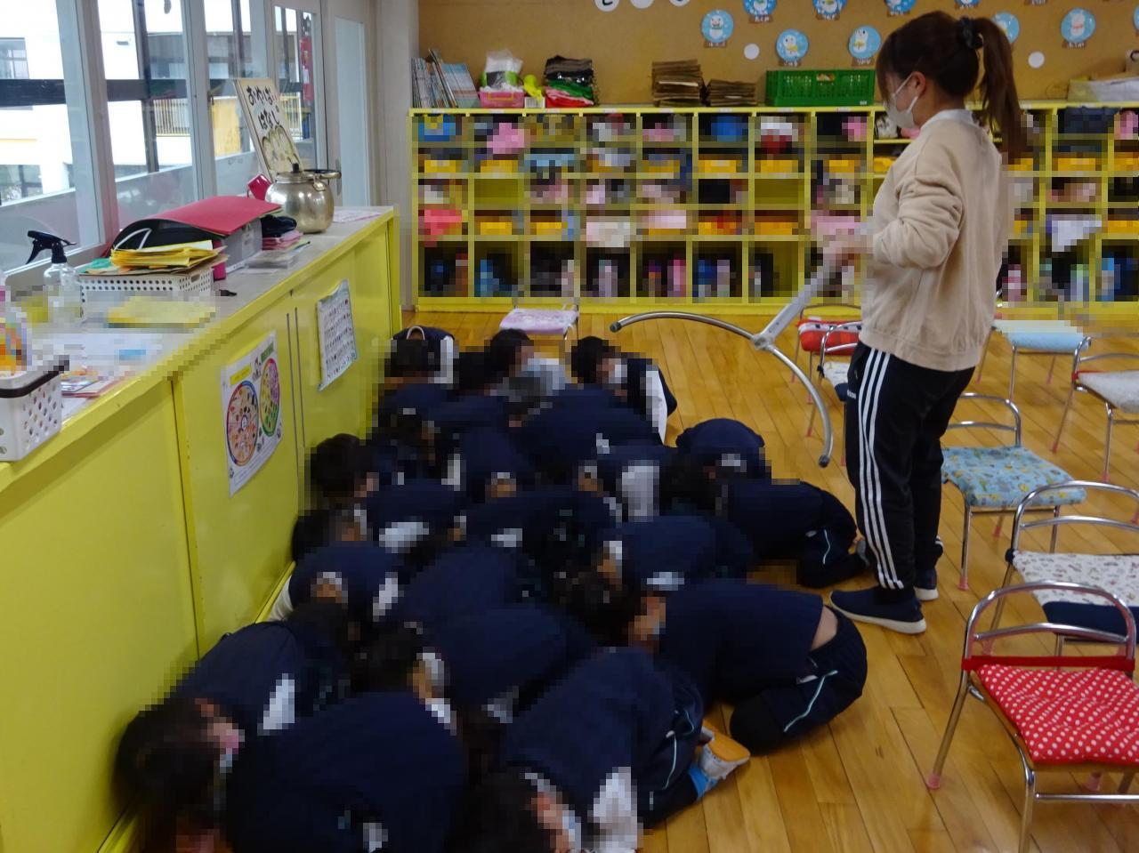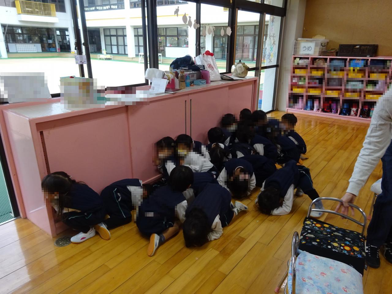 非常事態を知らせる笛の音や園長先生の放送を聞き、保育室内で棚の影に身を潜め、安全確認ができるまで上手に待機する子どもたち👦👧