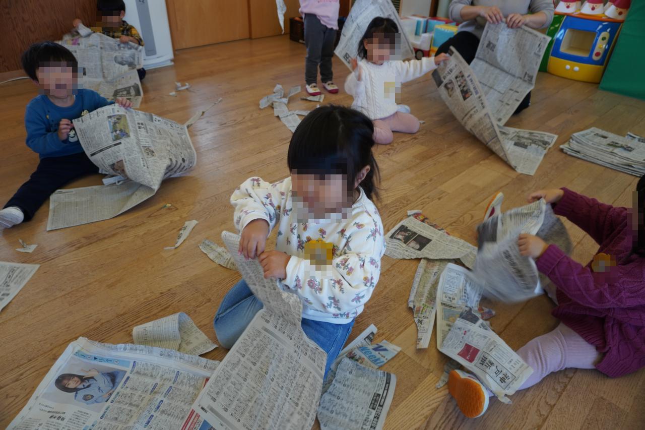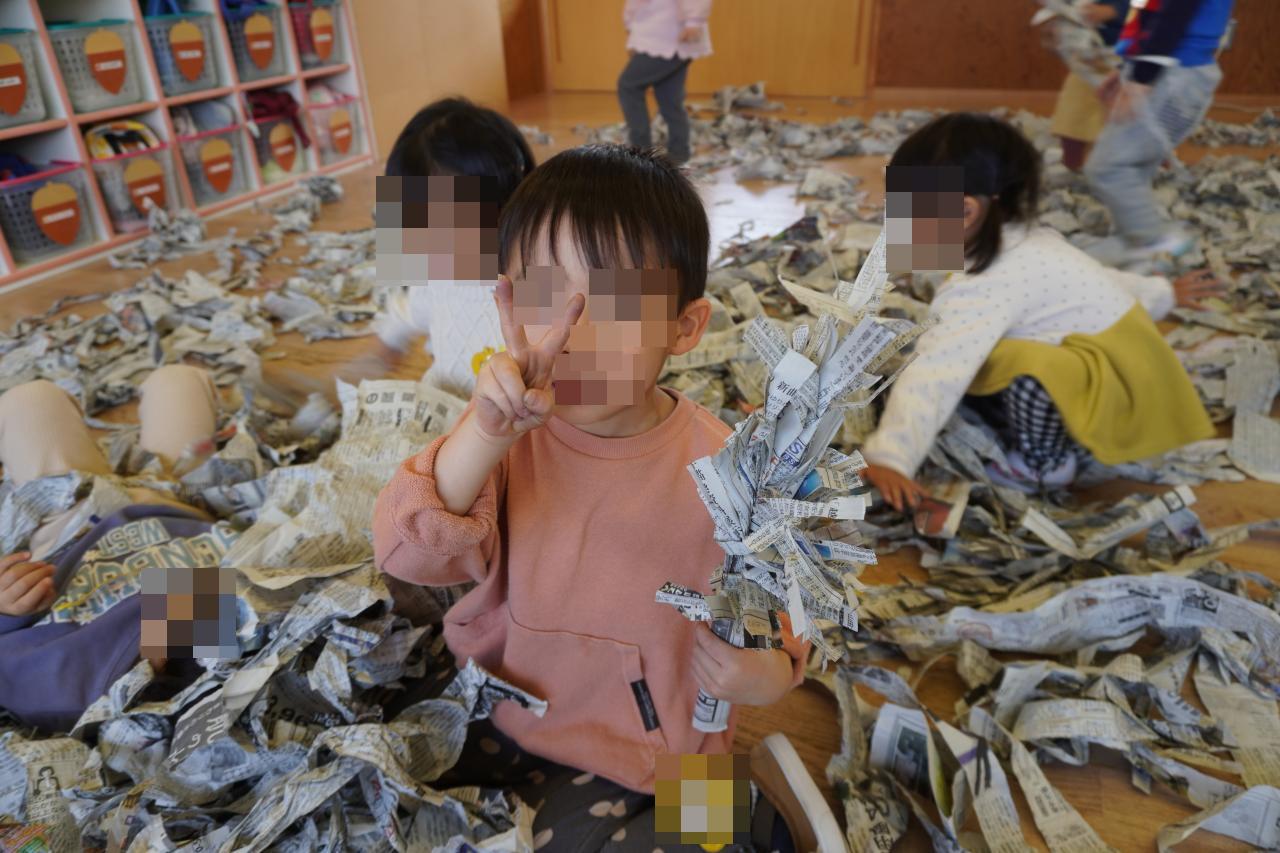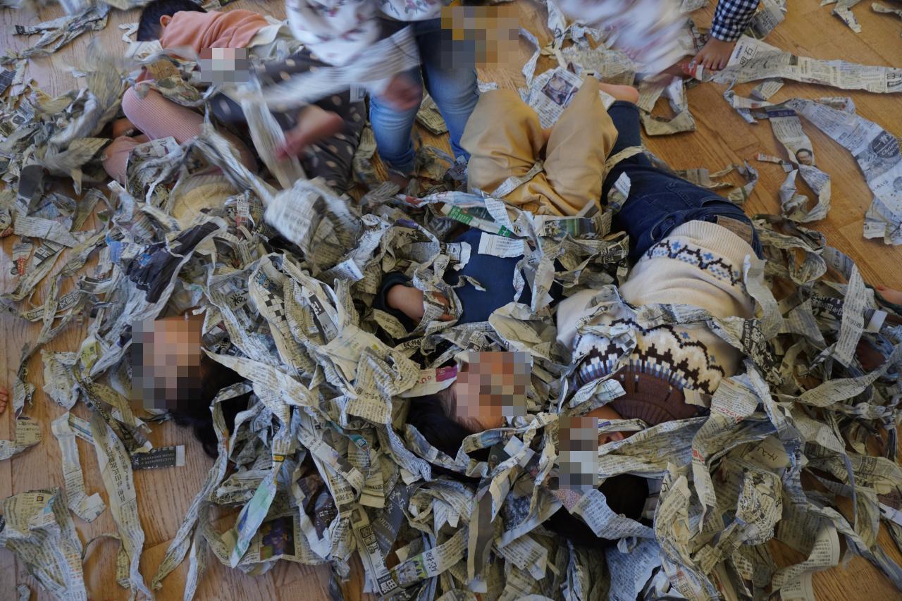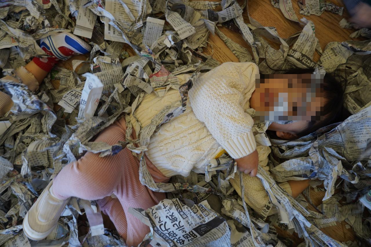 いろいろな形に変身させて遊んだあと、お部屋を見渡してみると保育室が新聞紙の海に!😳💦