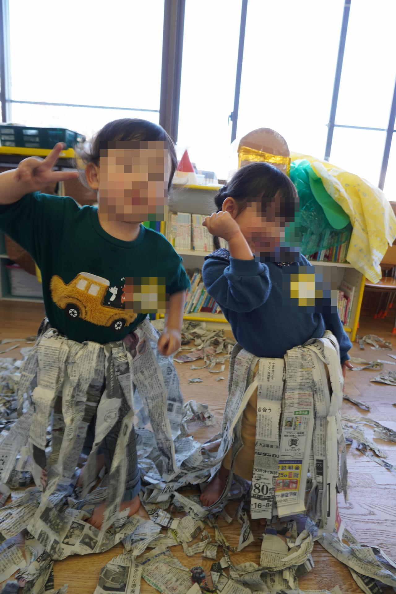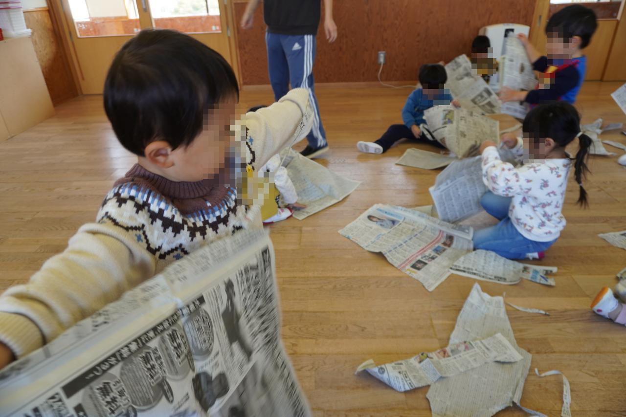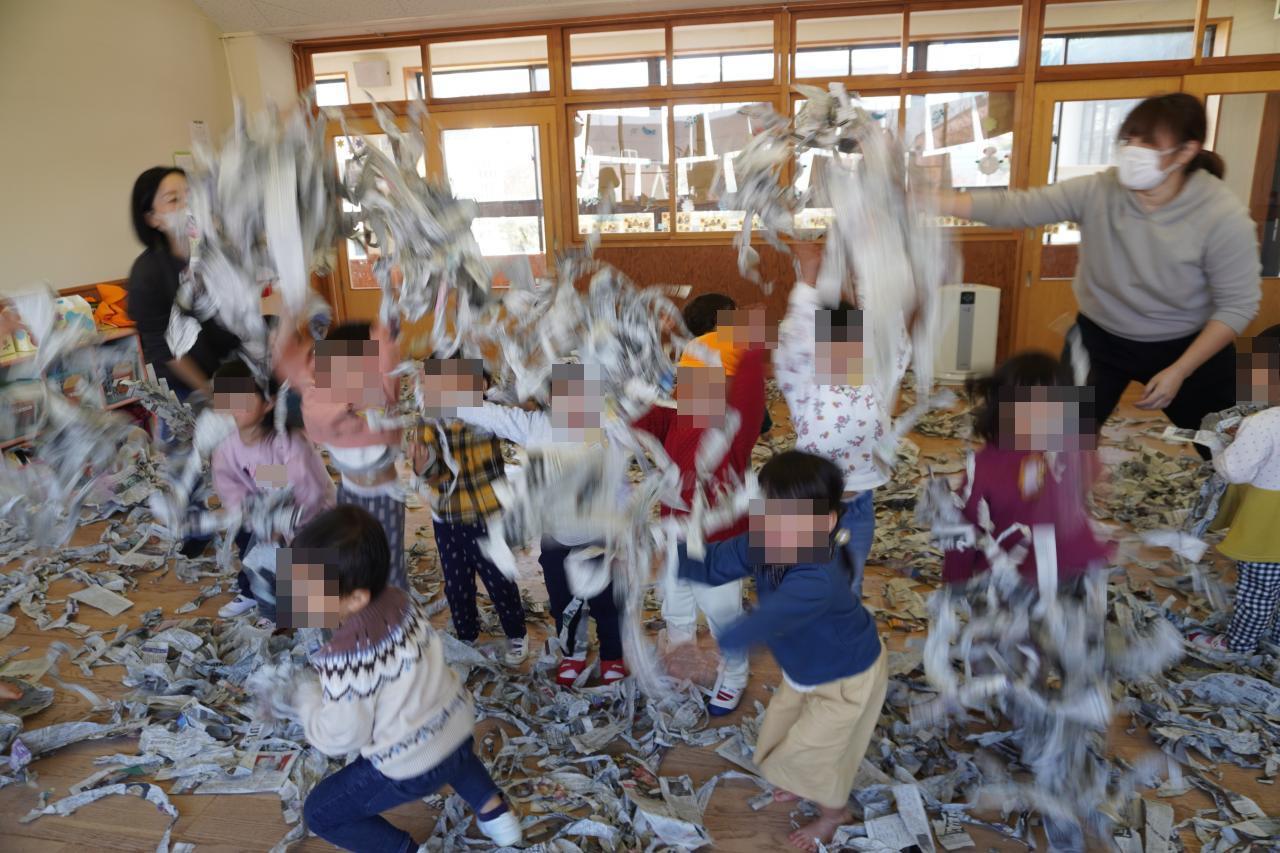 いろいろな形に変身させて遊んだあと、お部屋を見渡してみると保育室が新聞紙の海に!😳💦