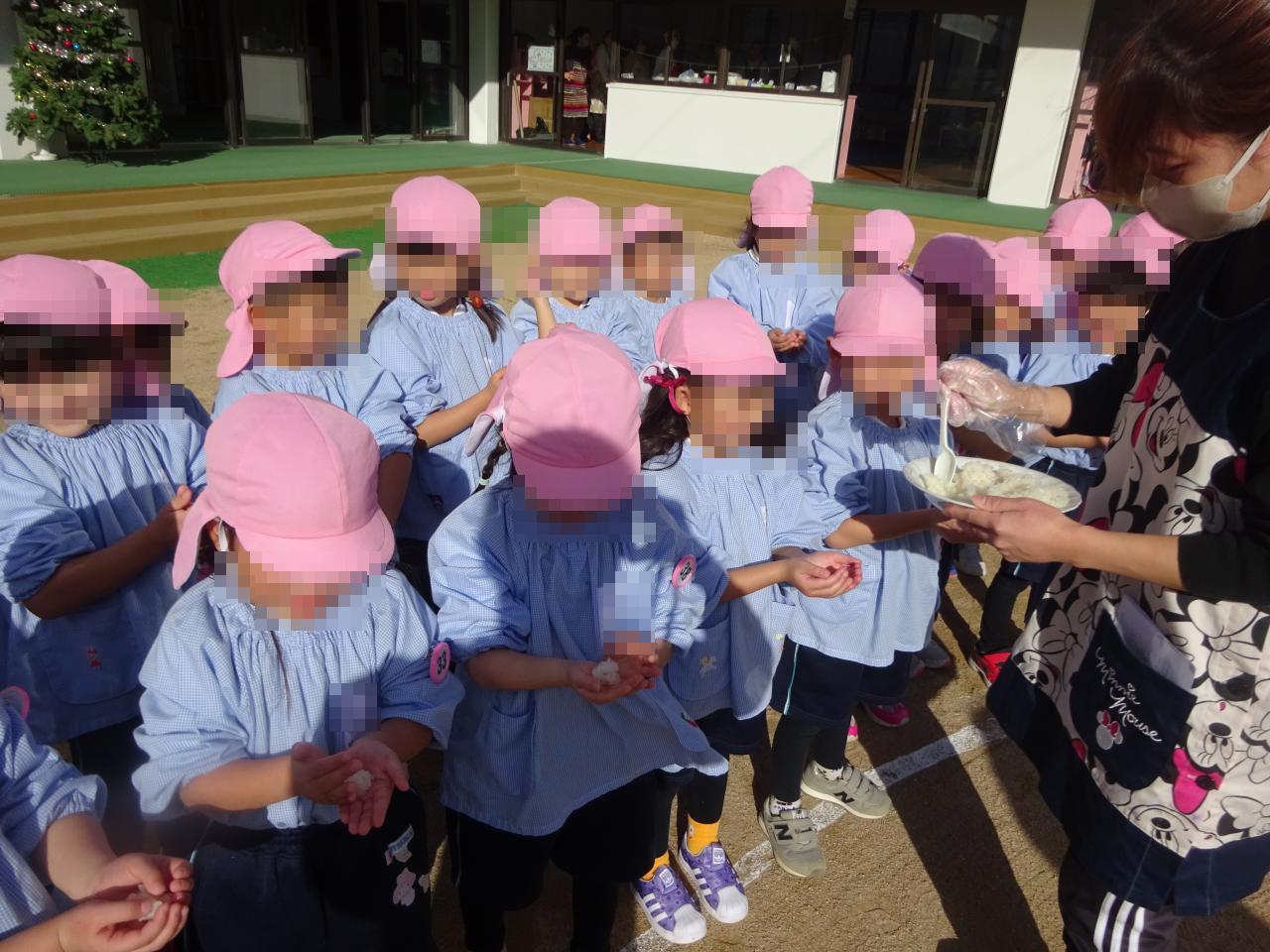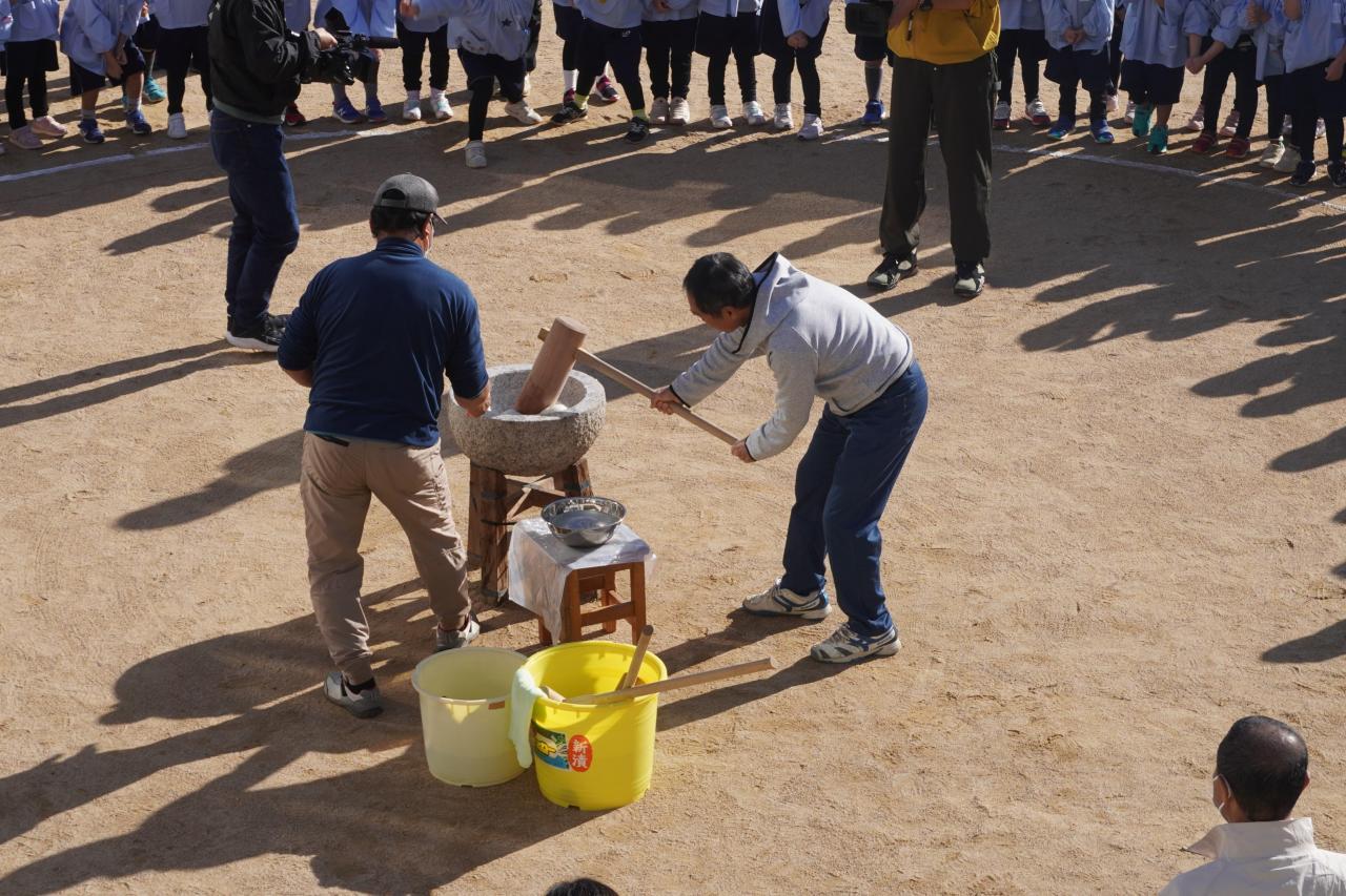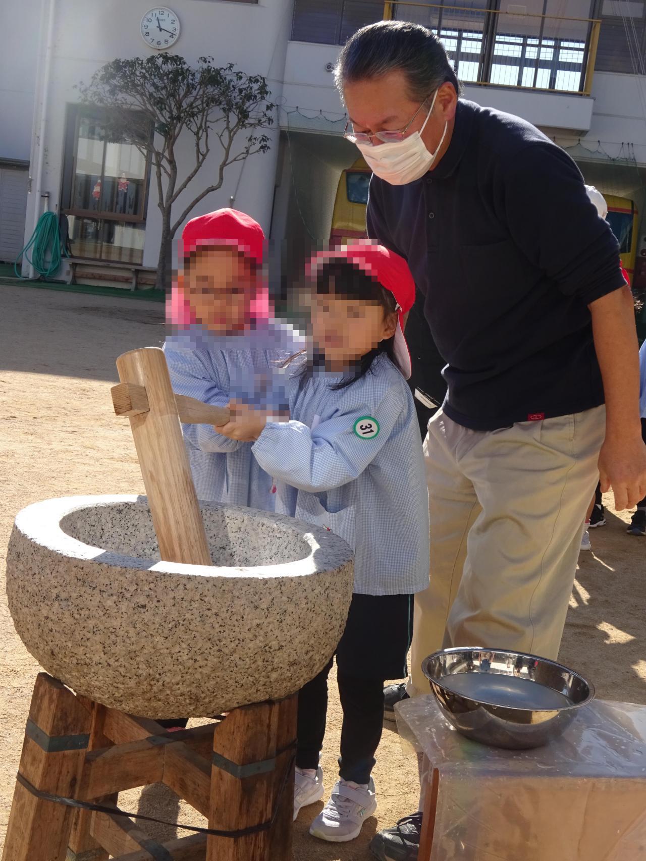 太陽の日差しが暖かく気持ちの良い天候の中、おもちつきを行いました❗