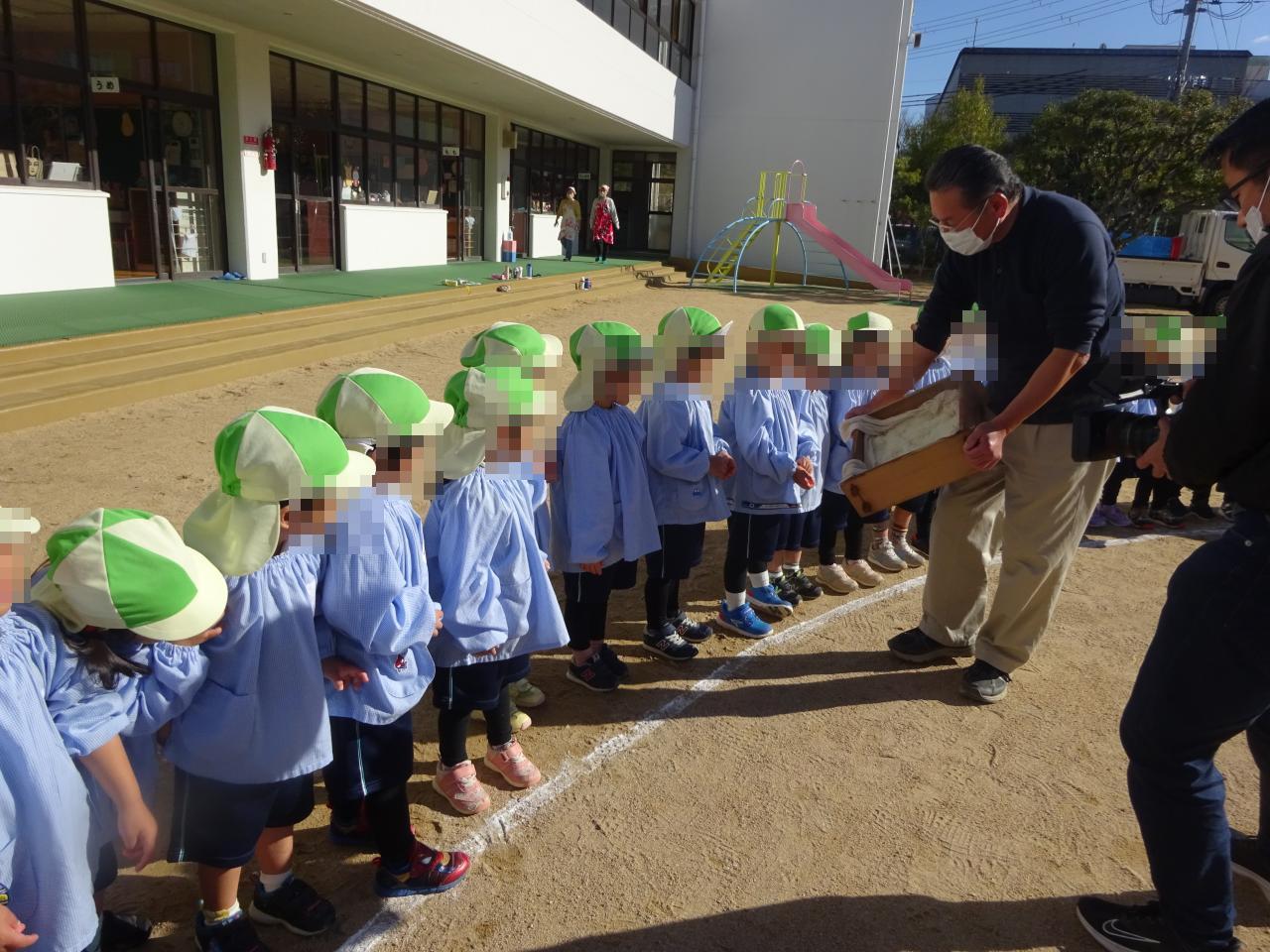 登園時から園庭の真ん中で準備が始まっており、白い煙がもくもくあがっている様子を見つめながら「熱そうやなあ~」「早くおもち食べたいなあ」と気持ちが高まっている様子の子どもたち👦👧