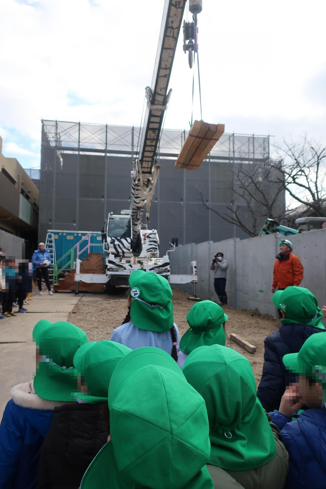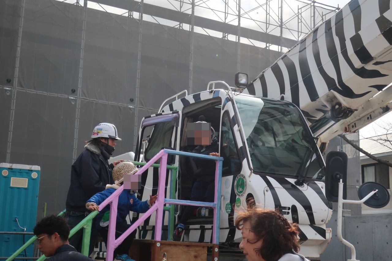 動物のクレーン車が有瀬幼稚園に来ていたので、素敵なヘルメットを被り一人ずつ特別に乗せてもらうことができました✨