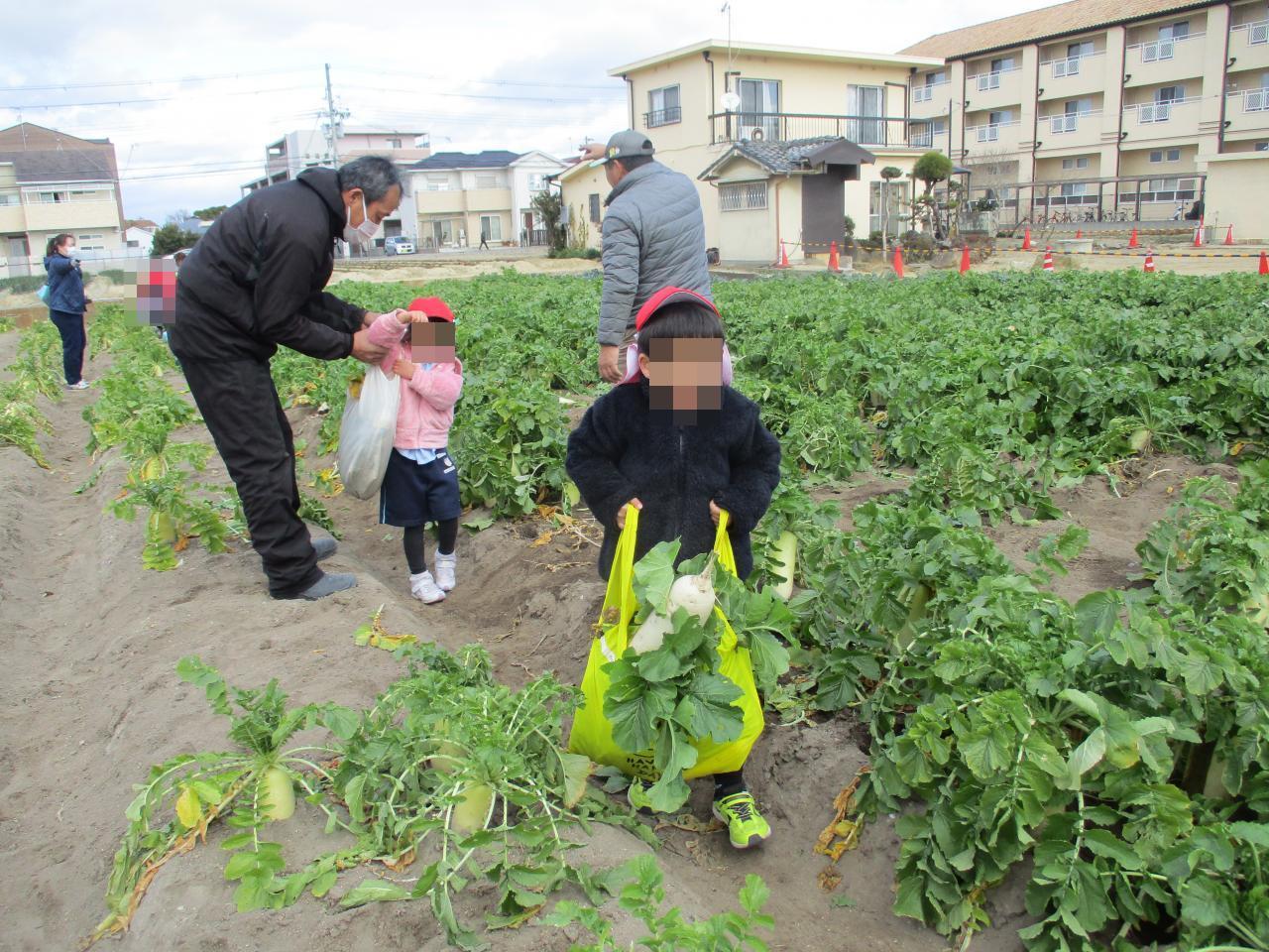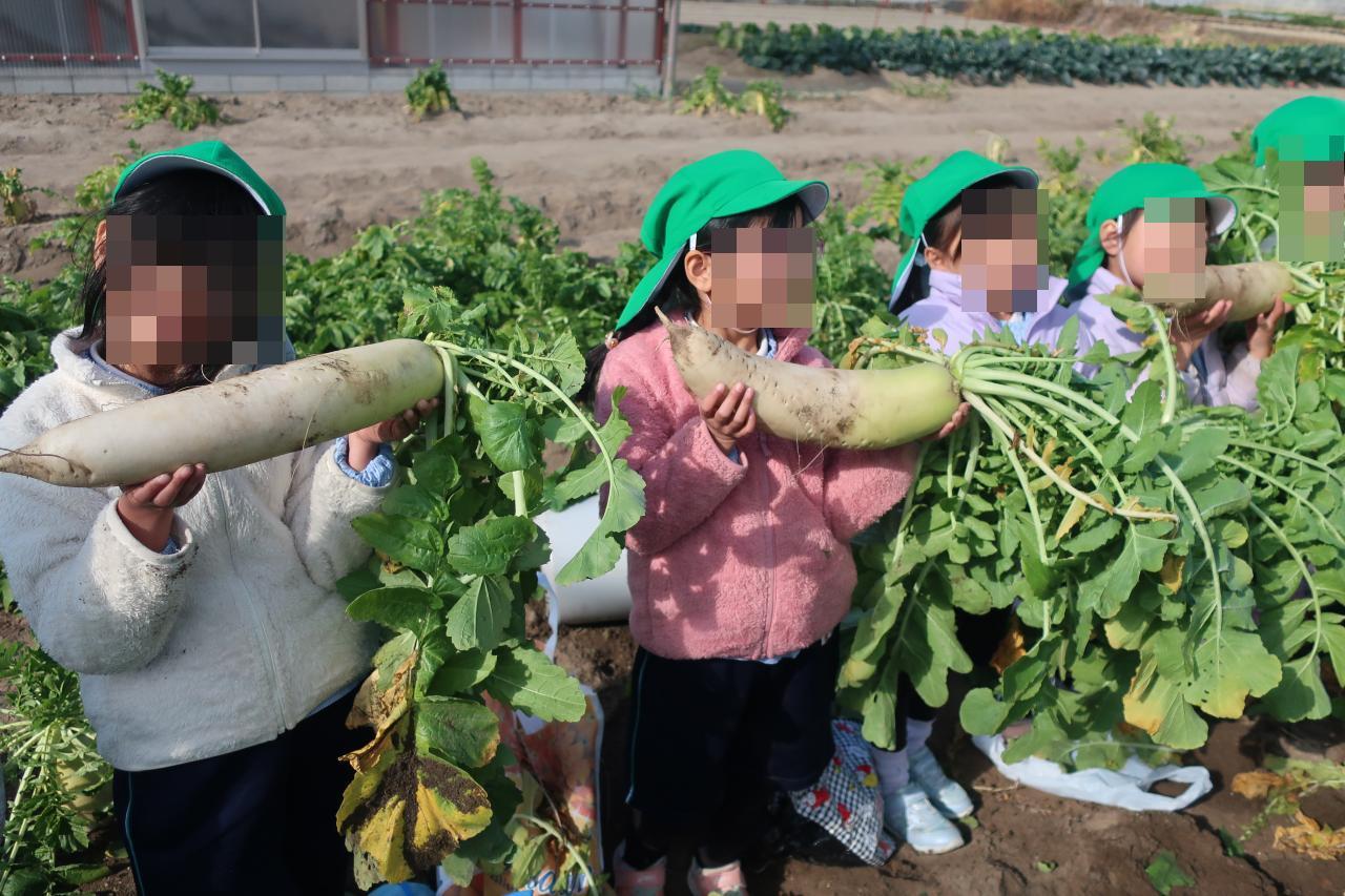 今回の大根収穫が、幼稚園生活最後の収穫でした。帰りのバスでは「今までたくさん収穫に行ったね!」と思い出を振り返る姿も見られました🍀
