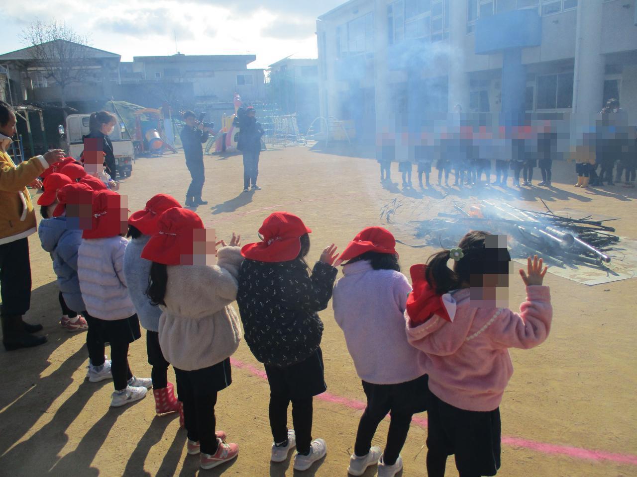 有瀬幼稚園に向かうバスの中では「今日はとんど祭りだね」「書き初め燃やすの❓」と話していた年長さんでしたが、到着するとすぐに大きなやぐらが見え、興味津々でした😳