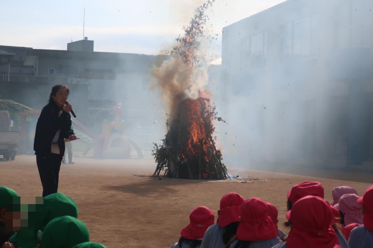 理事長先生がやぐらに火をつけると、たくさんの煙がでてきて、パチパチという音をさせながら燃え始めました❗