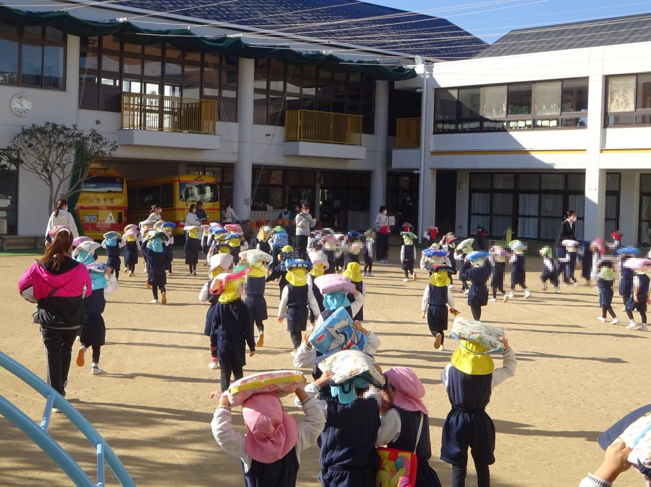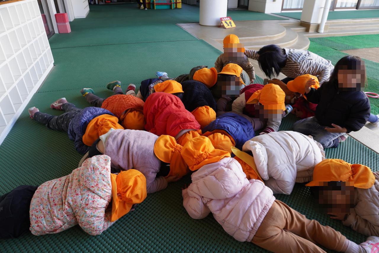毎月の訓練の成果もあり、園長先生の放送を聞きながらとても上手に体を守る姿勢をとる子どもたち👏