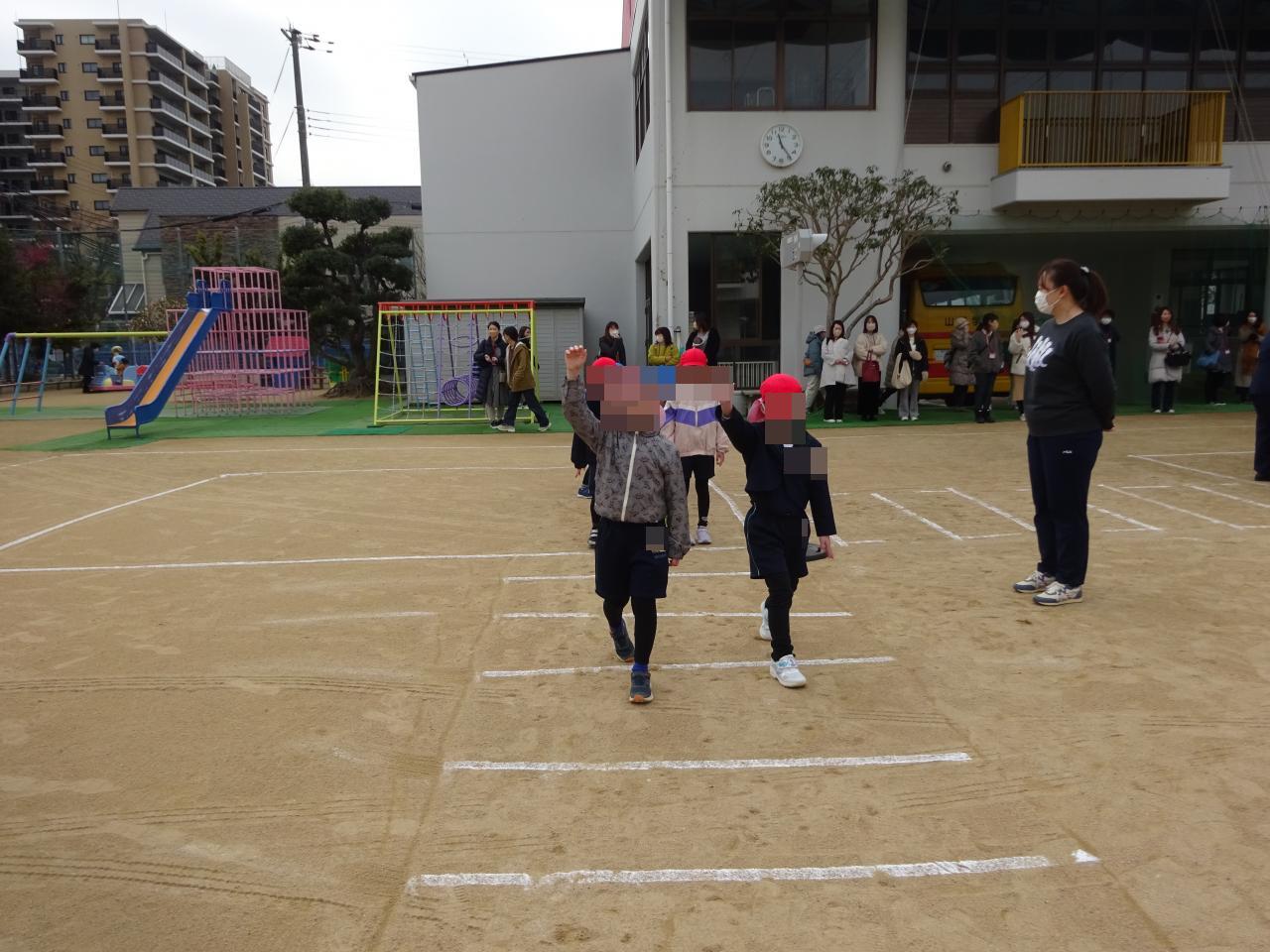 その後は、大ホールで学んだことを活かしながら「右、左、右」「今信号は青!」と実際に声に出しながら園庭で歩行訓練を行いました🚶