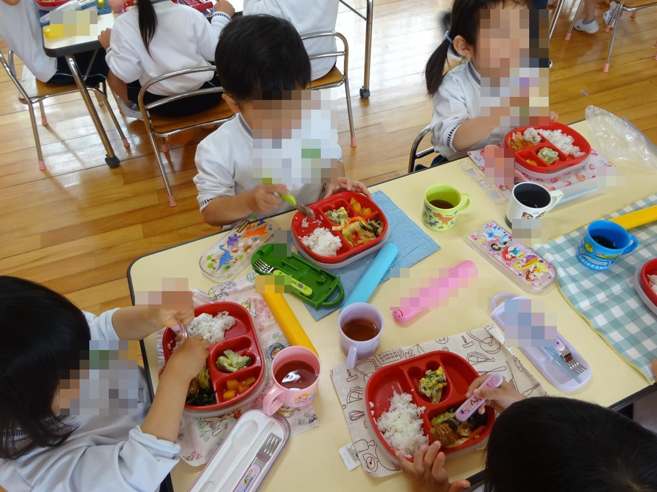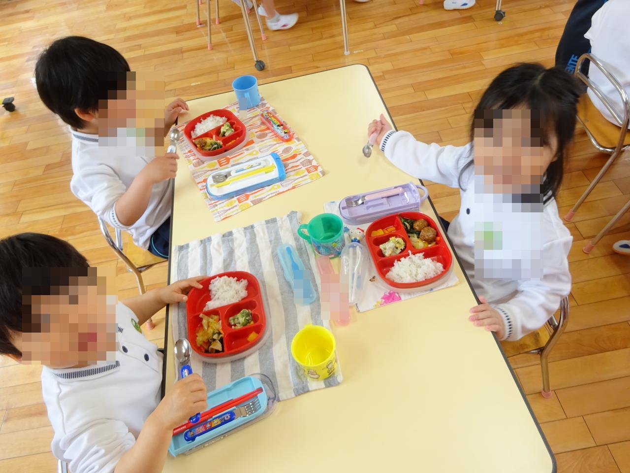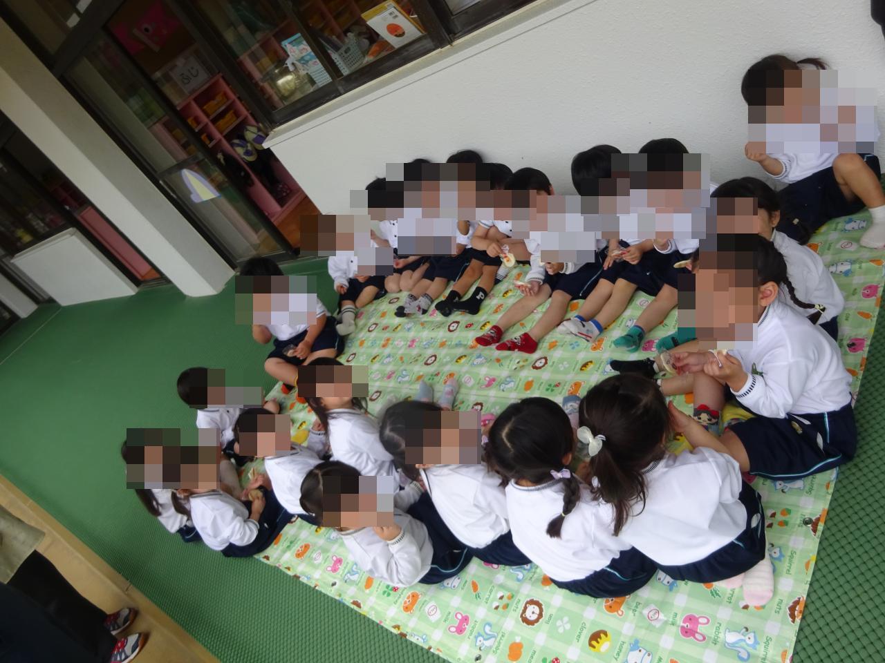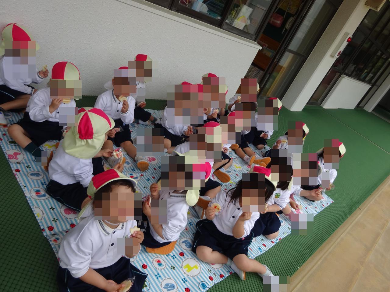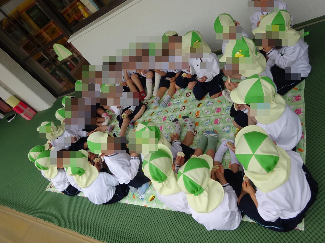 年少さんは、その後気持ち良い風の吹くなか、緑マットでぱりんこを食べました😆