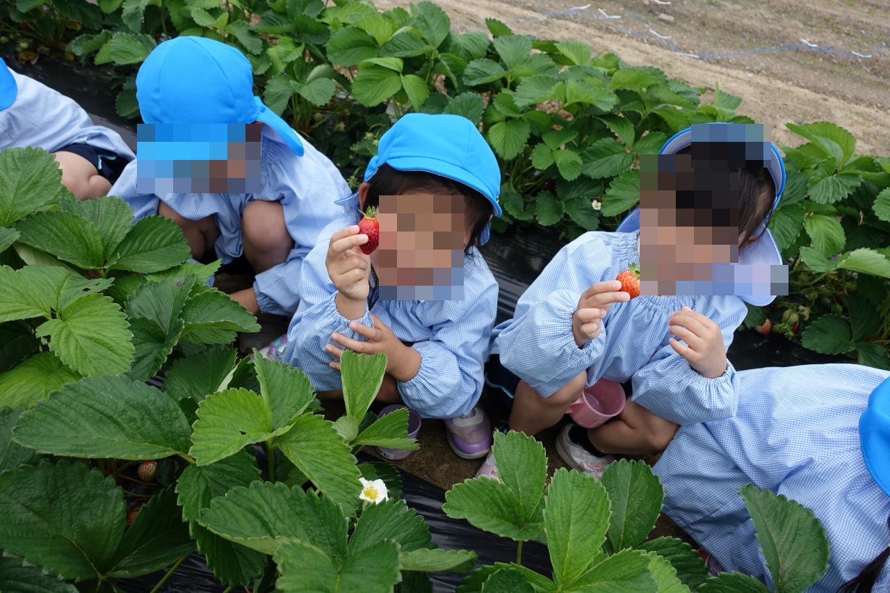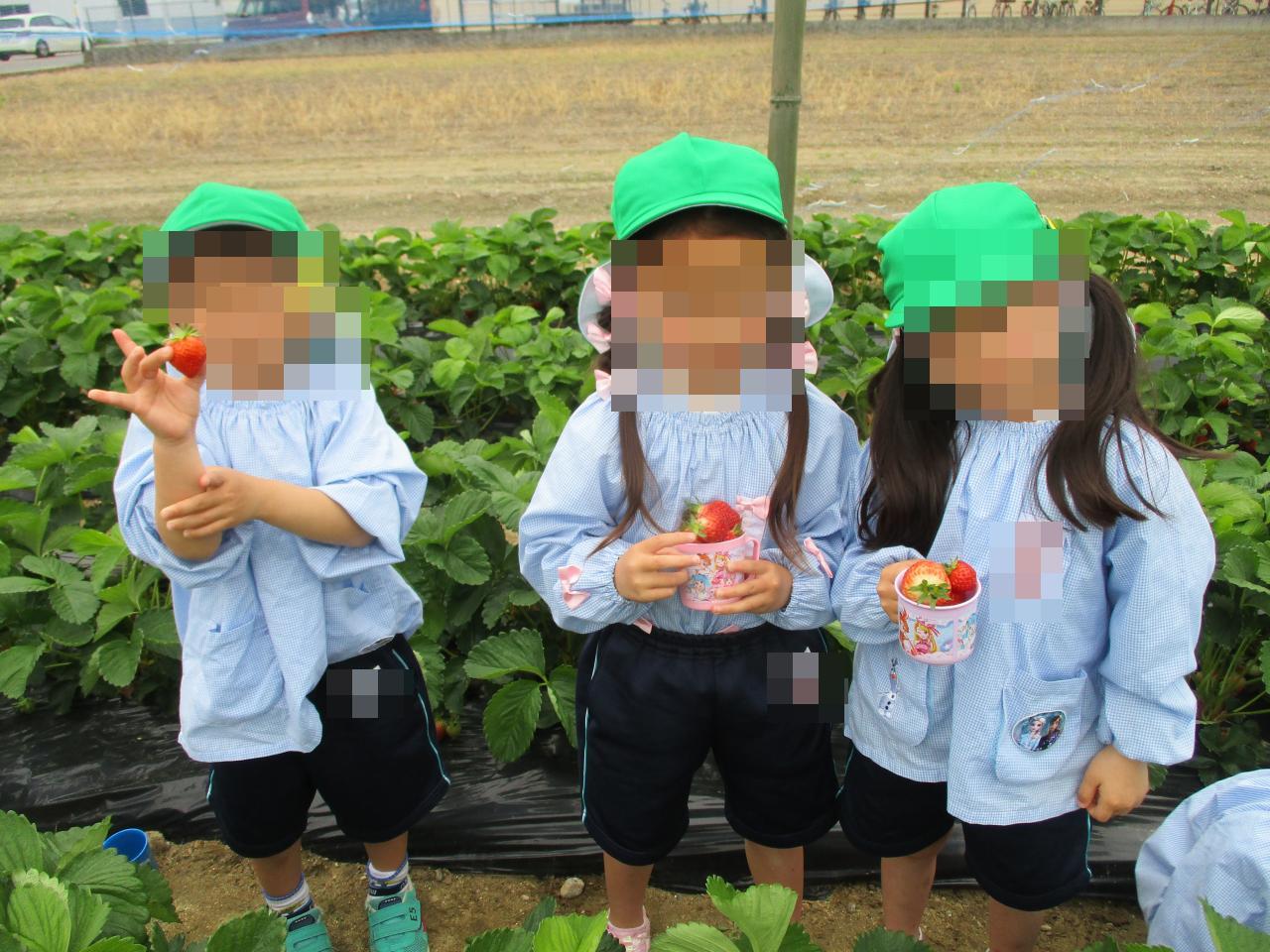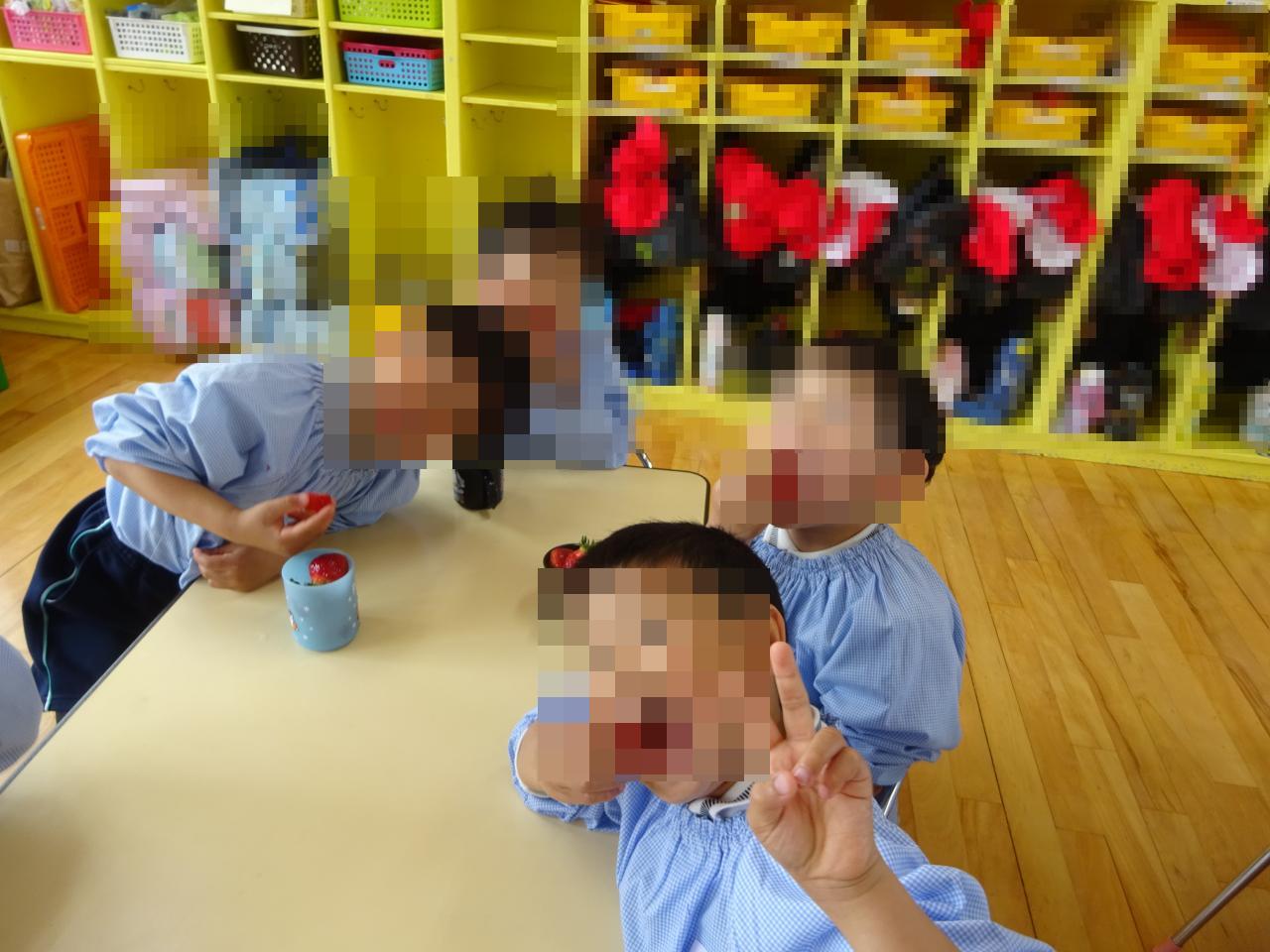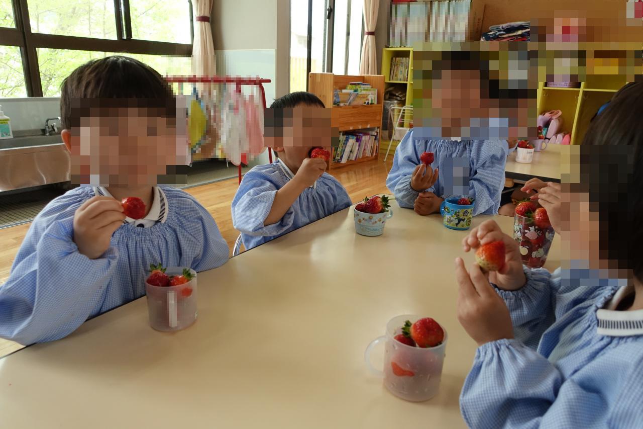 園に到着後、赤いいちごを頬張る子どもたち🤩「甘くておいしい!」と満足した様子でした🍀