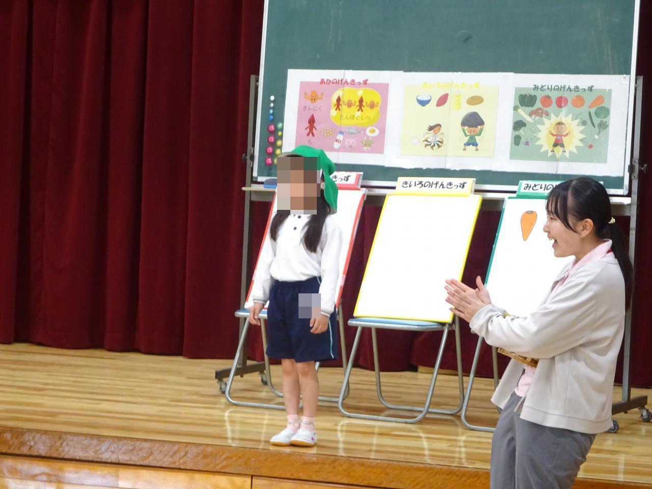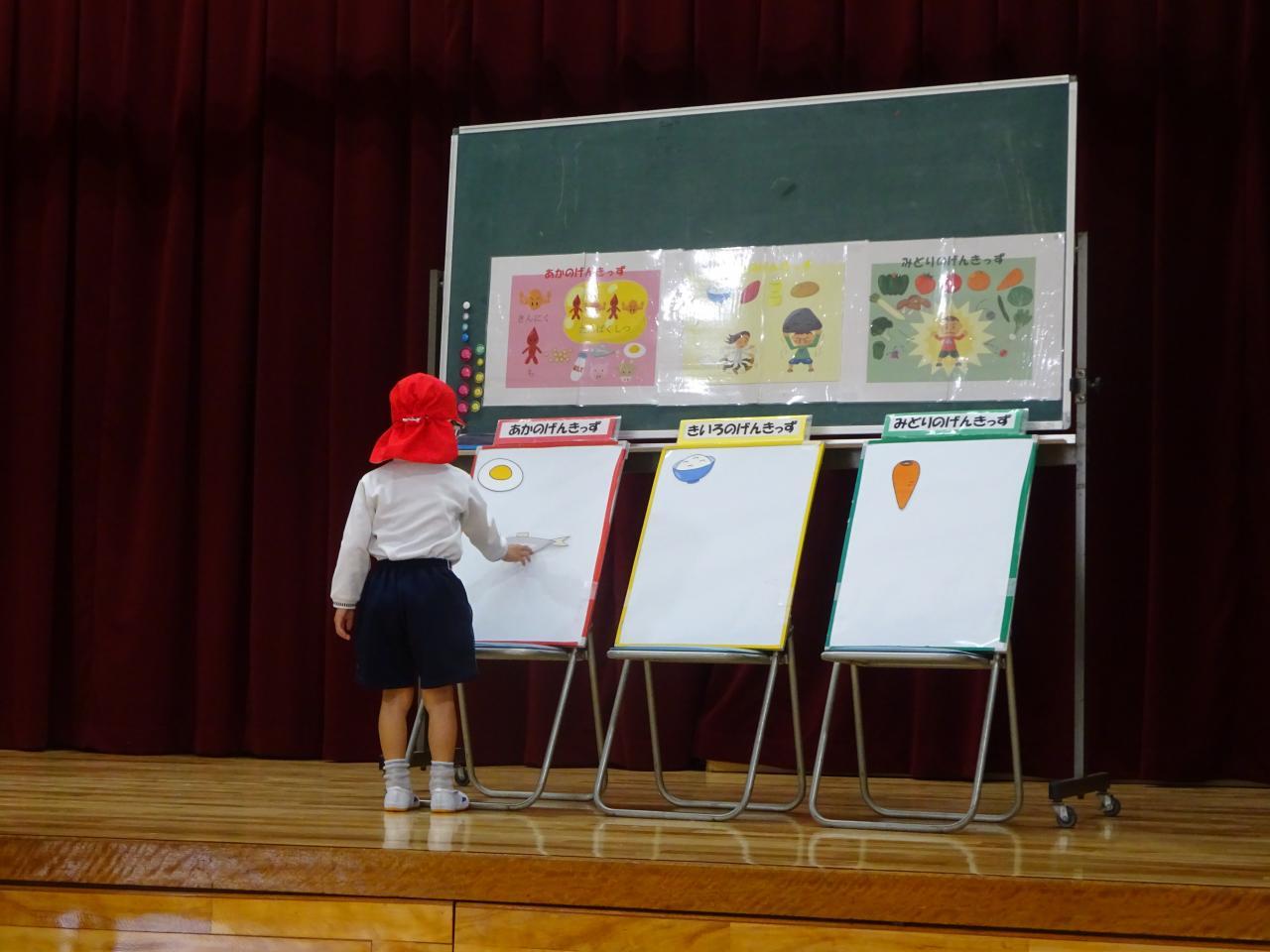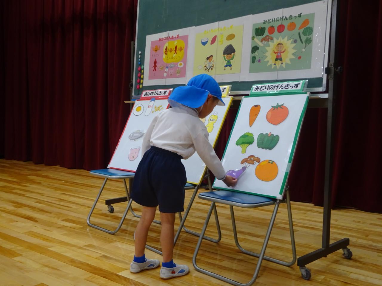 毎日、すっきりした排便ができるようにバランスの整った食事が必要ということで、「あかのげんきっず」「きいろのげんきっず」「みどりのげんきっず」の食材を教えてもらいながら、子どもたちも食材の分類に挑戦しました🍎🍞🐟