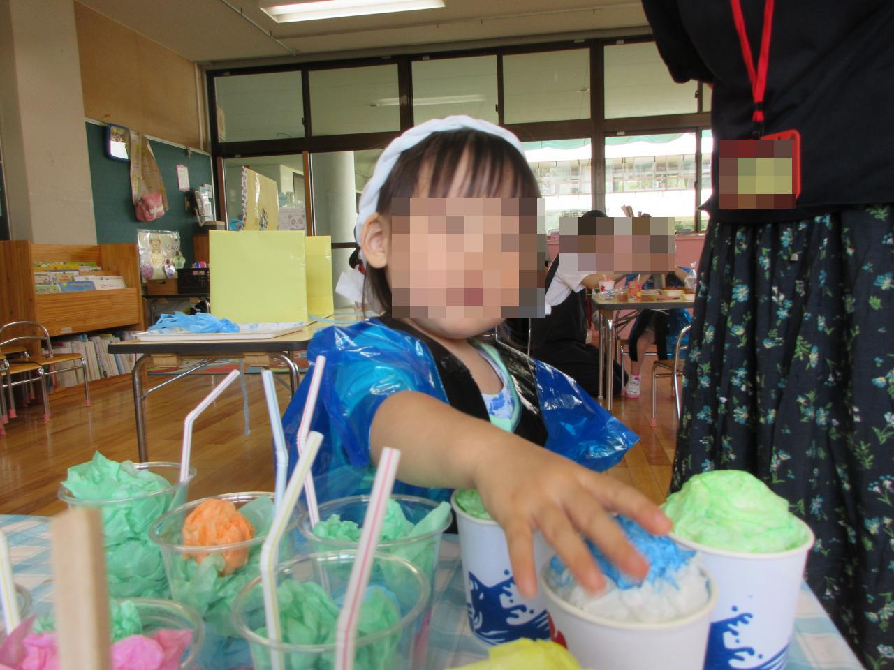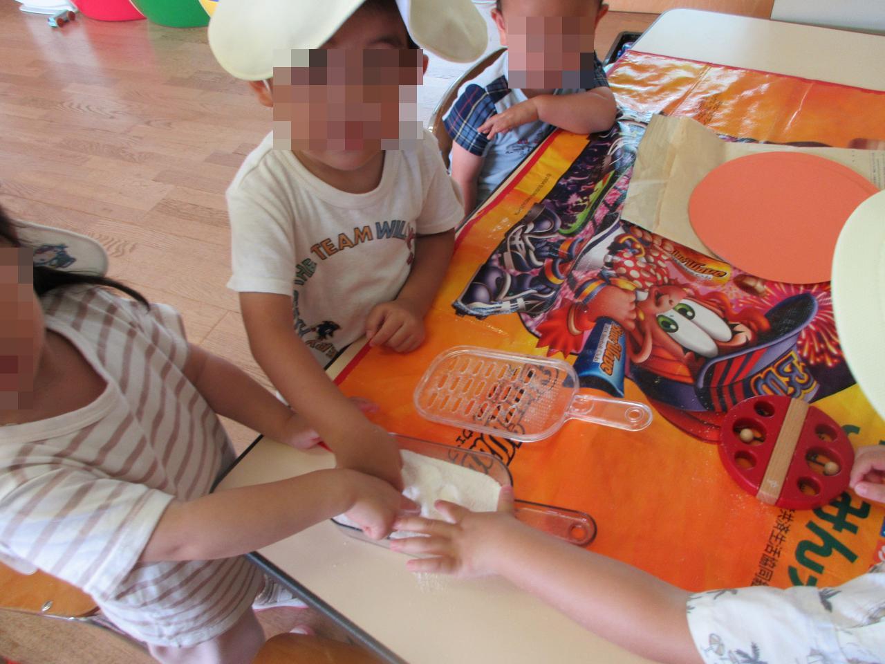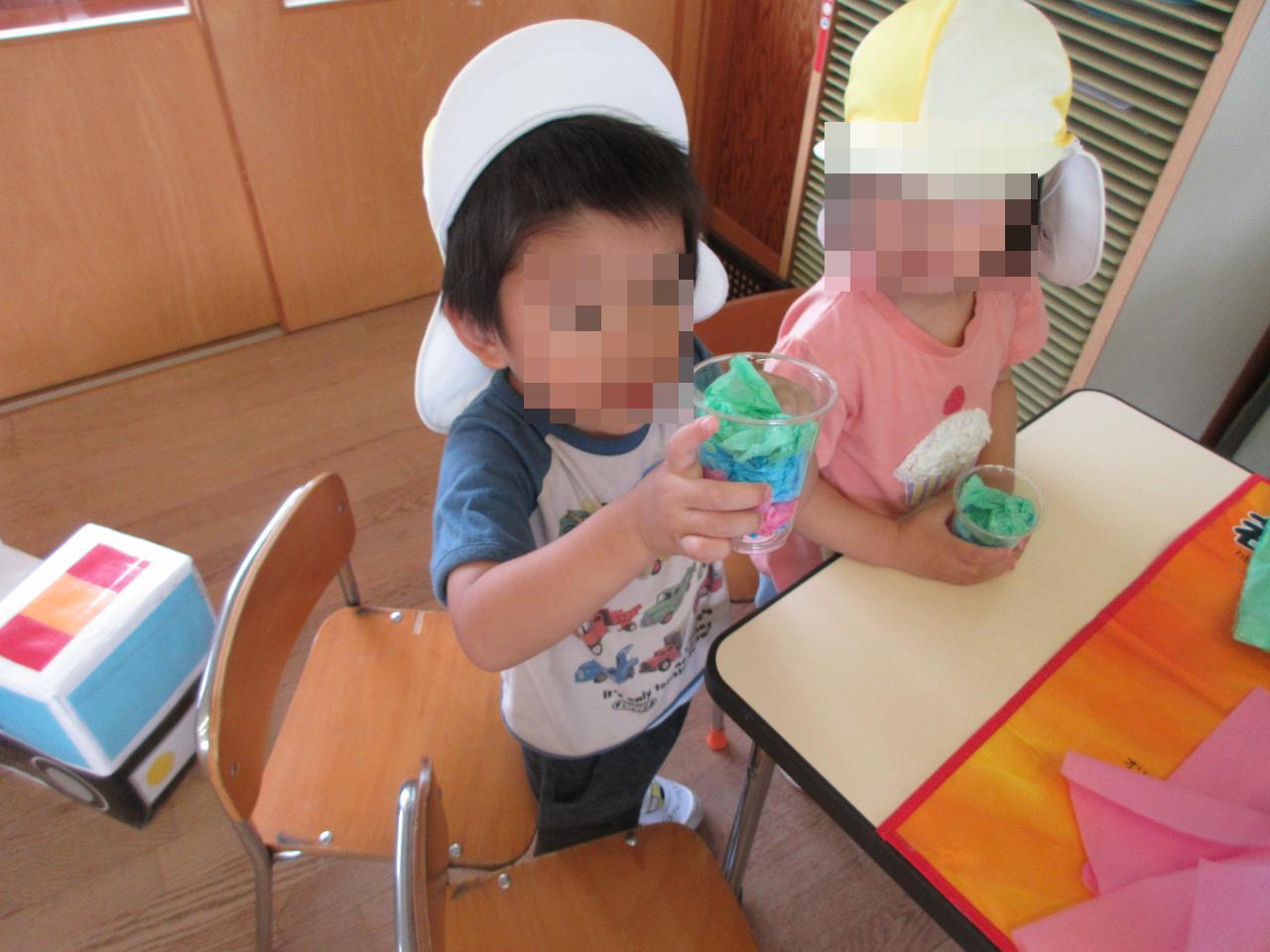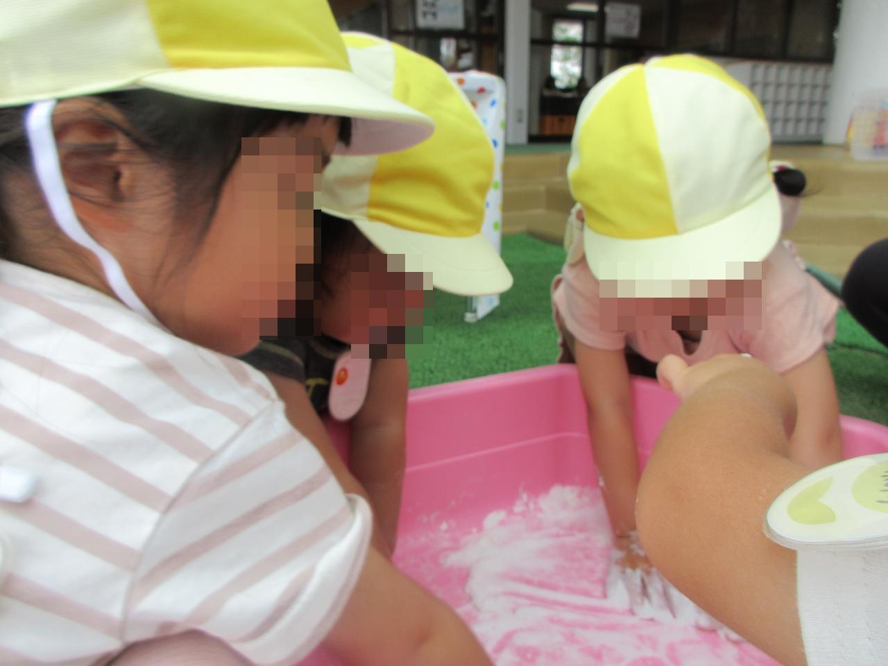 たくさん混ぜて泡の感触を楽しんだり、色水と混ぜて遊んだりと、自分たちで好きなように