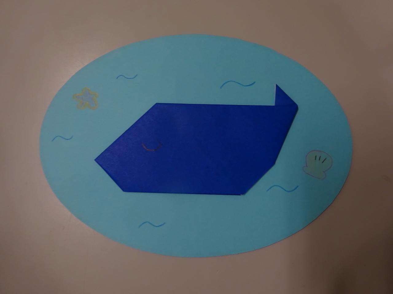 ②くじらの折り方のお手紙を見ながら、青色の折り紙を使ってくじらを折ります。