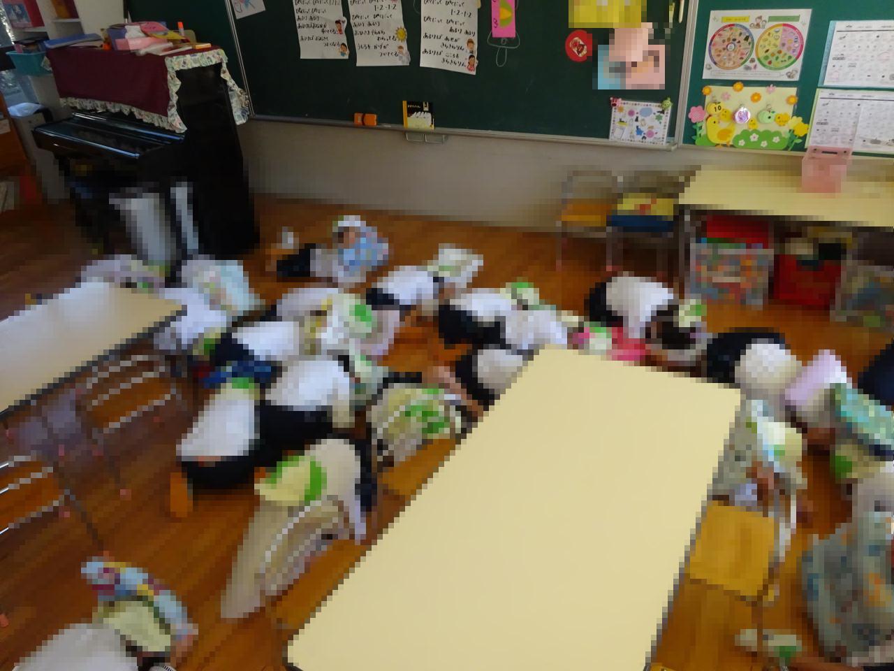 サイレンが鳴ると子どもたちは約束事をしっかり思い出し、座布団で頭を守り身を小さくするなど、、、自分の命を守る行動がすぐにできていました✨