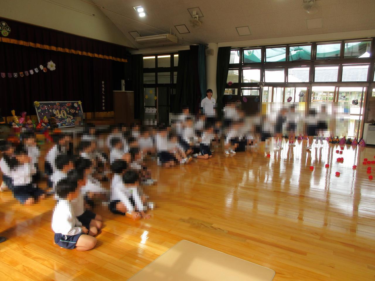 朝から大ホールに集まり、まずは全園児で朝の活動を行いました!