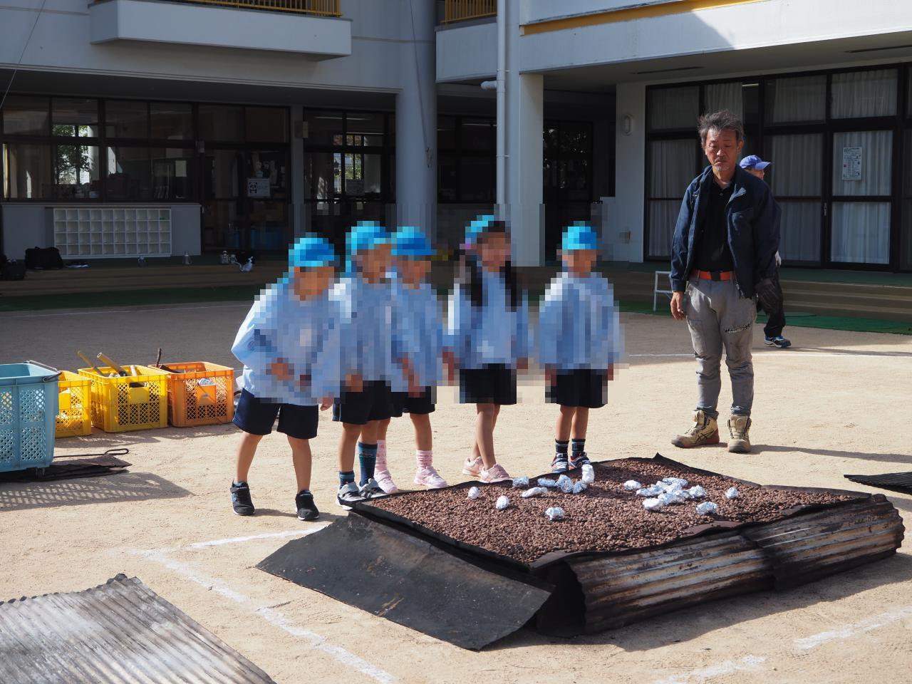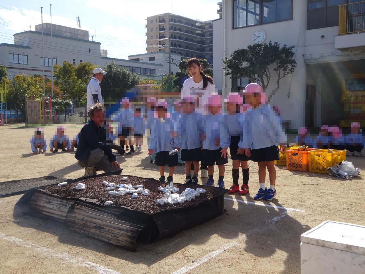 やきいもについての話を聞いた後、「おいしくな~れ🌟」と願いを込めて、1人一つさつまいもを投げました😄