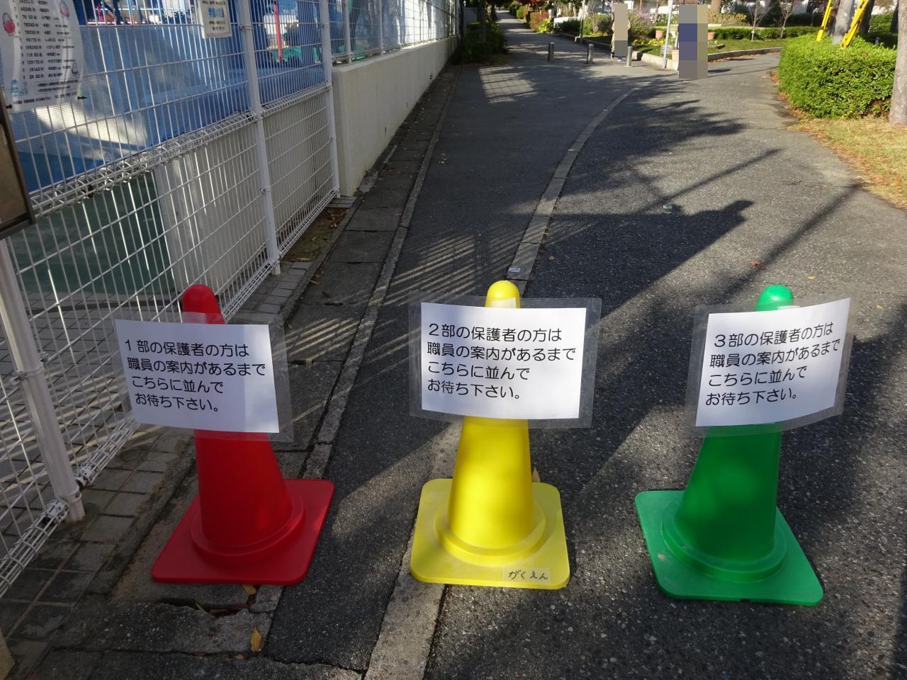 開門・開場時間前に来られる方は、職員が誘導を行うまで園門前に設置しておりますコーンの前に、各部ごとに並んでお待ちいただきますようにお願いいたします。