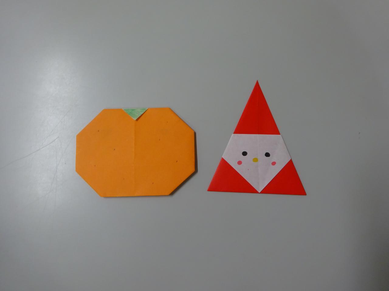 サンタクロースとみかんの折り紙を配布しています。