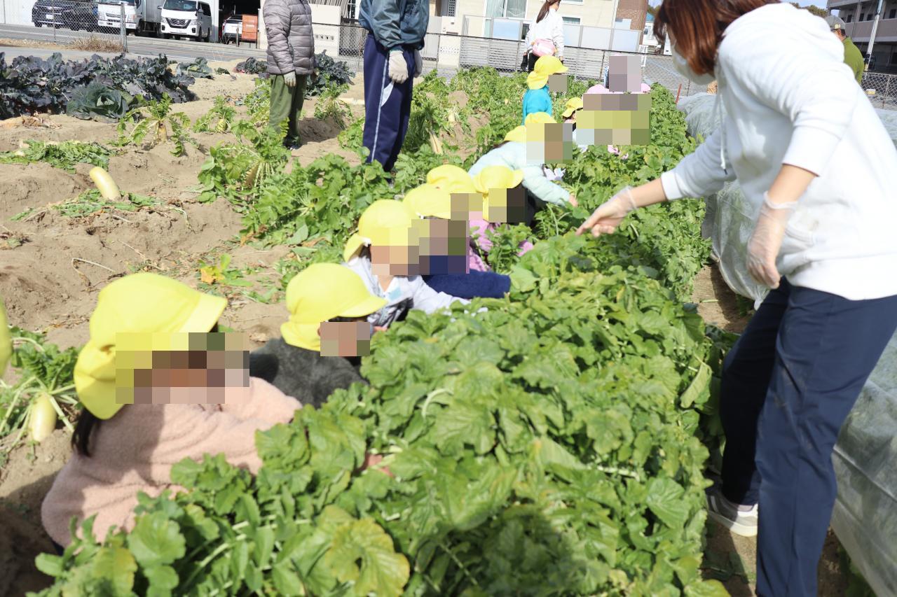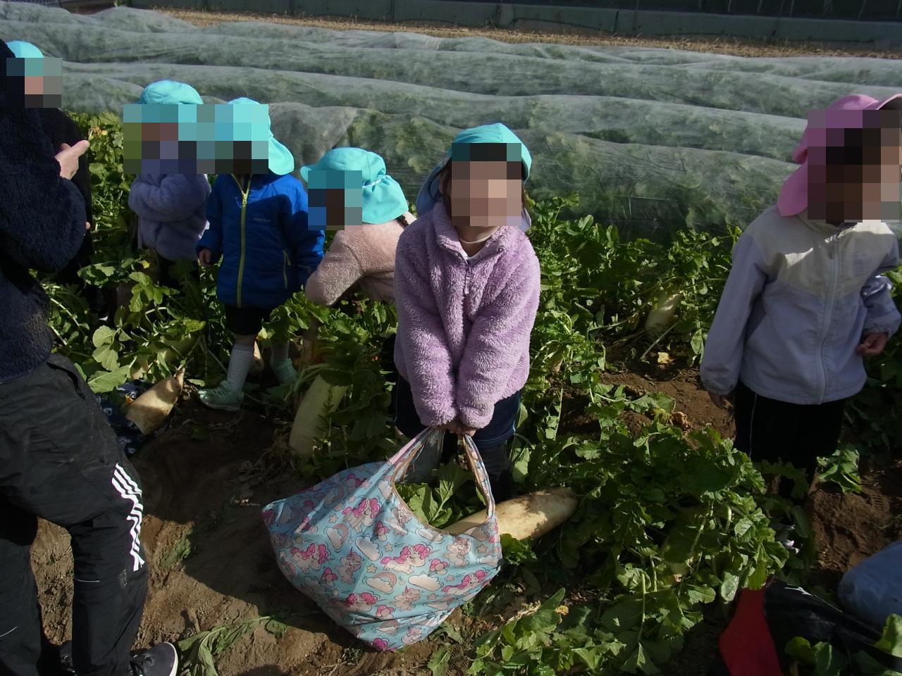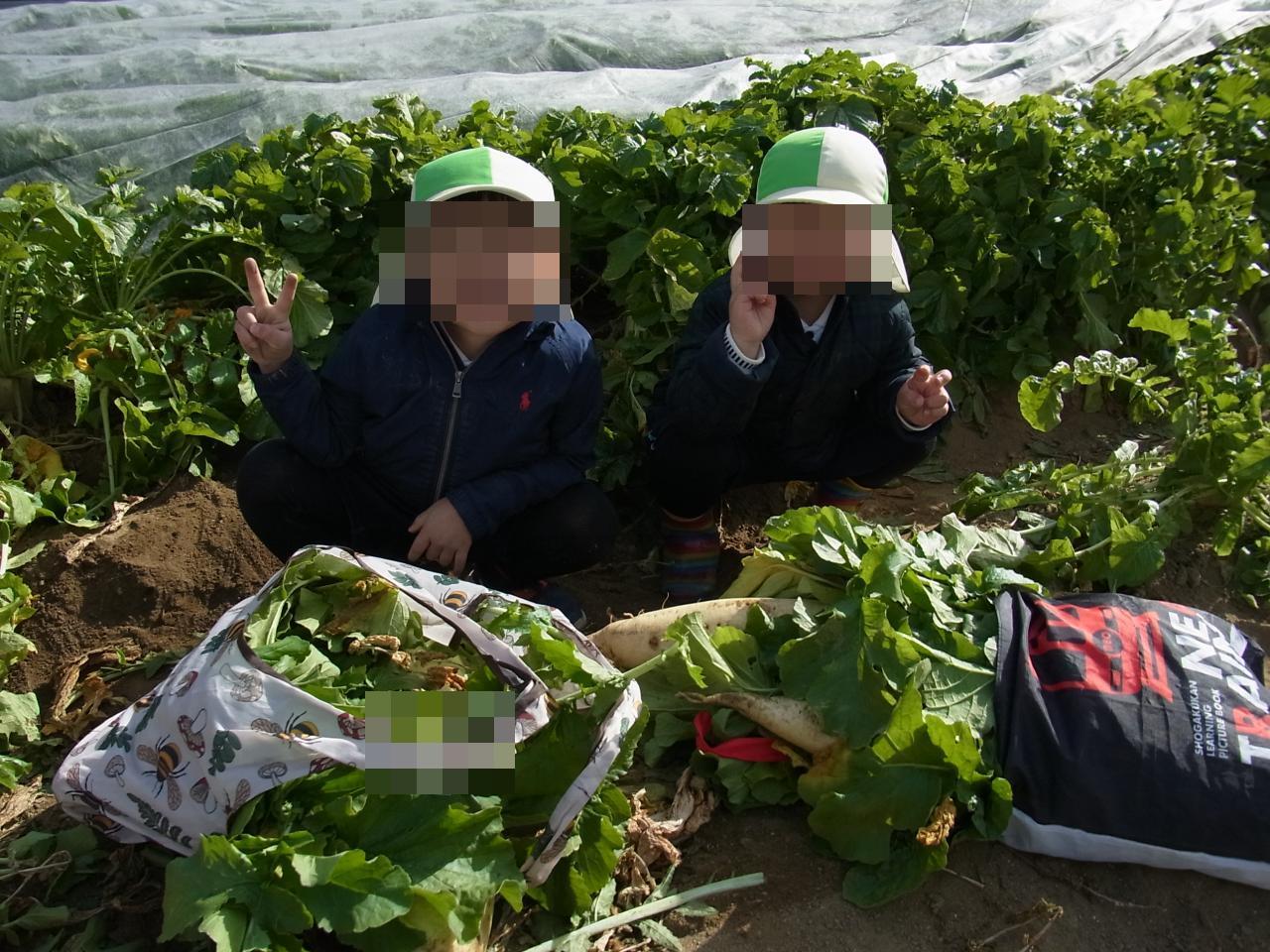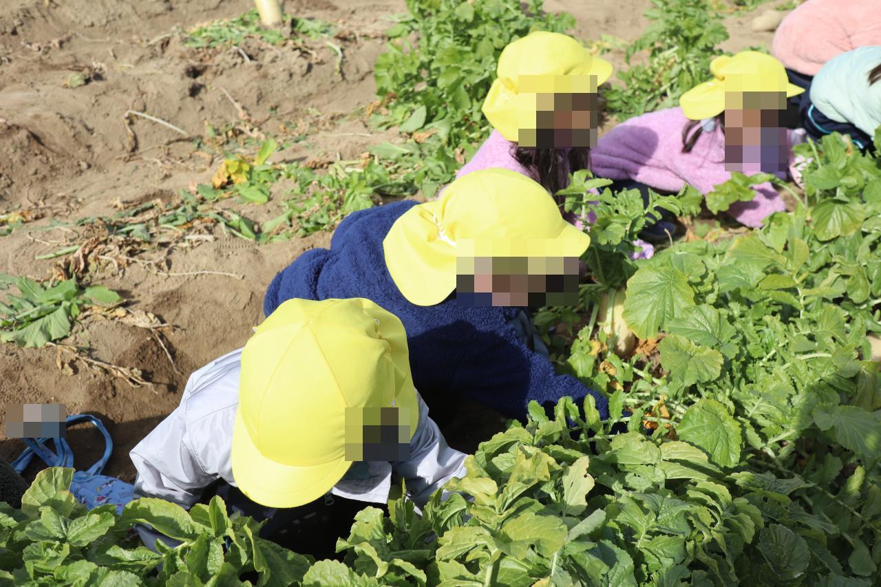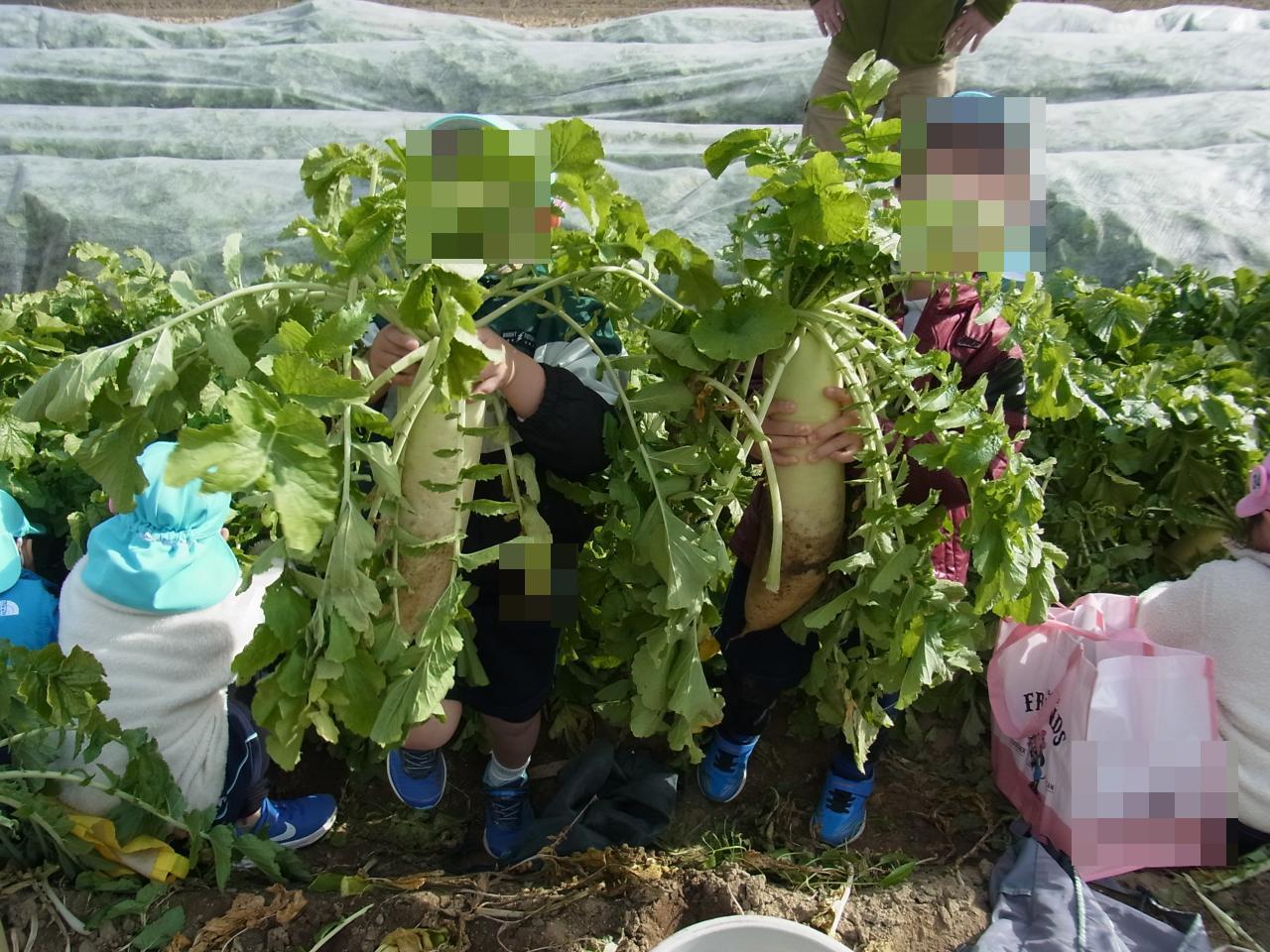 今日は天気の良い中、年中児で大根収穫に行きました!