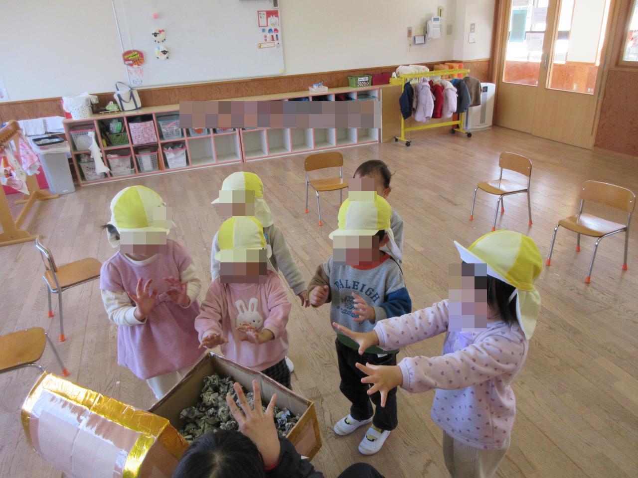そして昨日はみんなで作った鬼の帽子とパワーを込めた豆を使って豆まきをしました✨