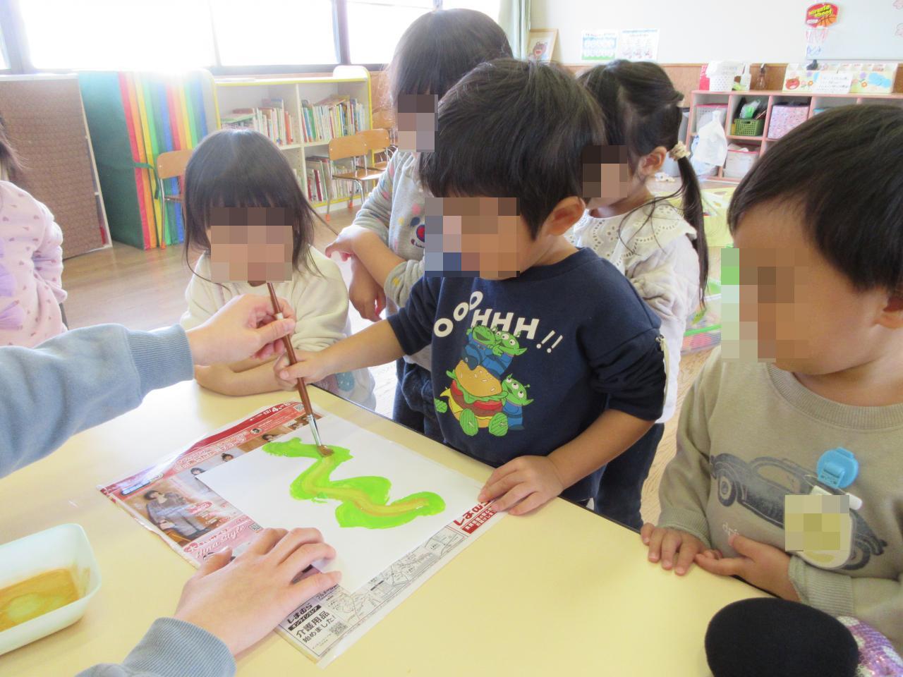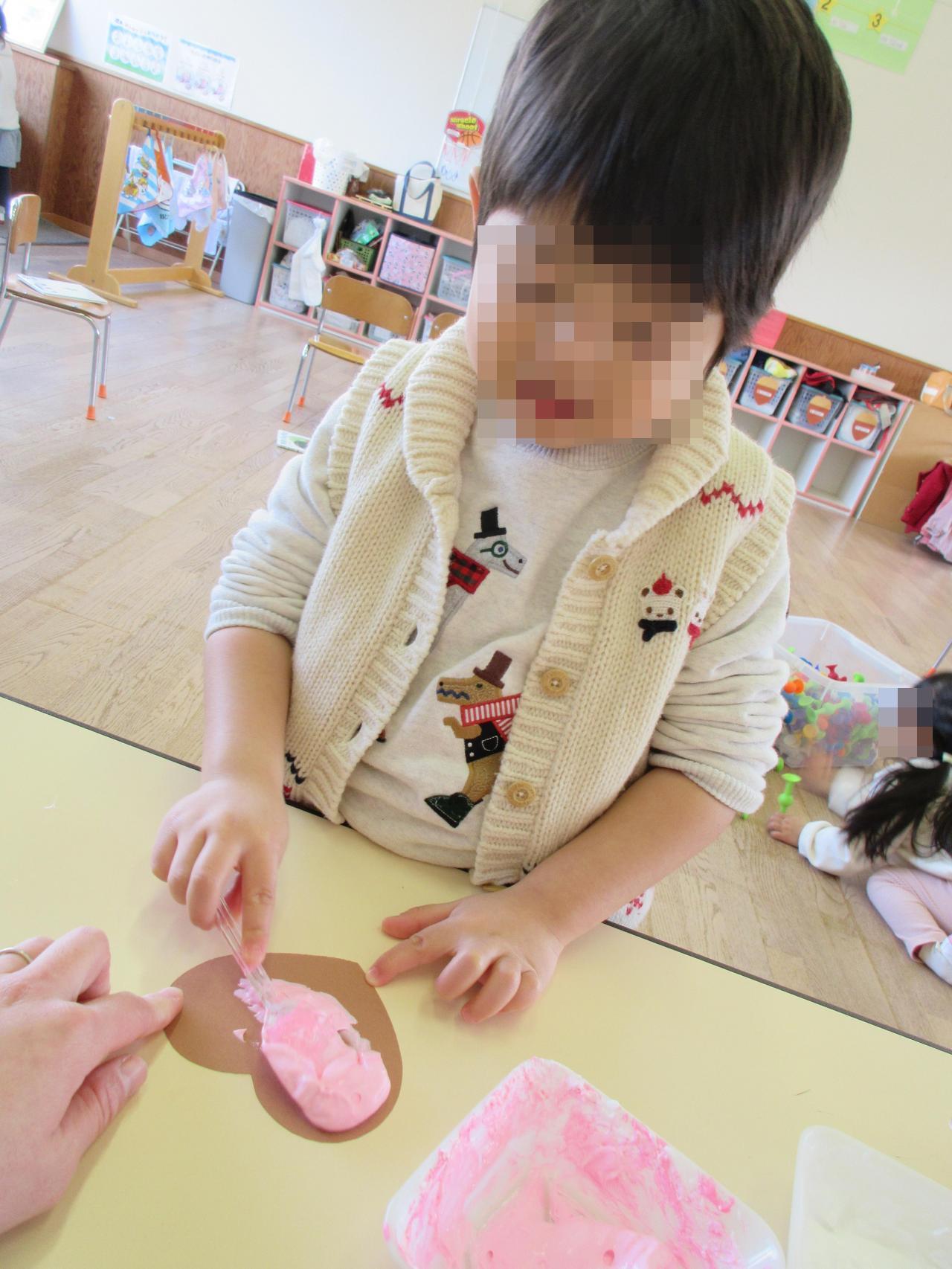「イチゴクリームにする!」とニコニコで絵の具をのせた子どもたち!