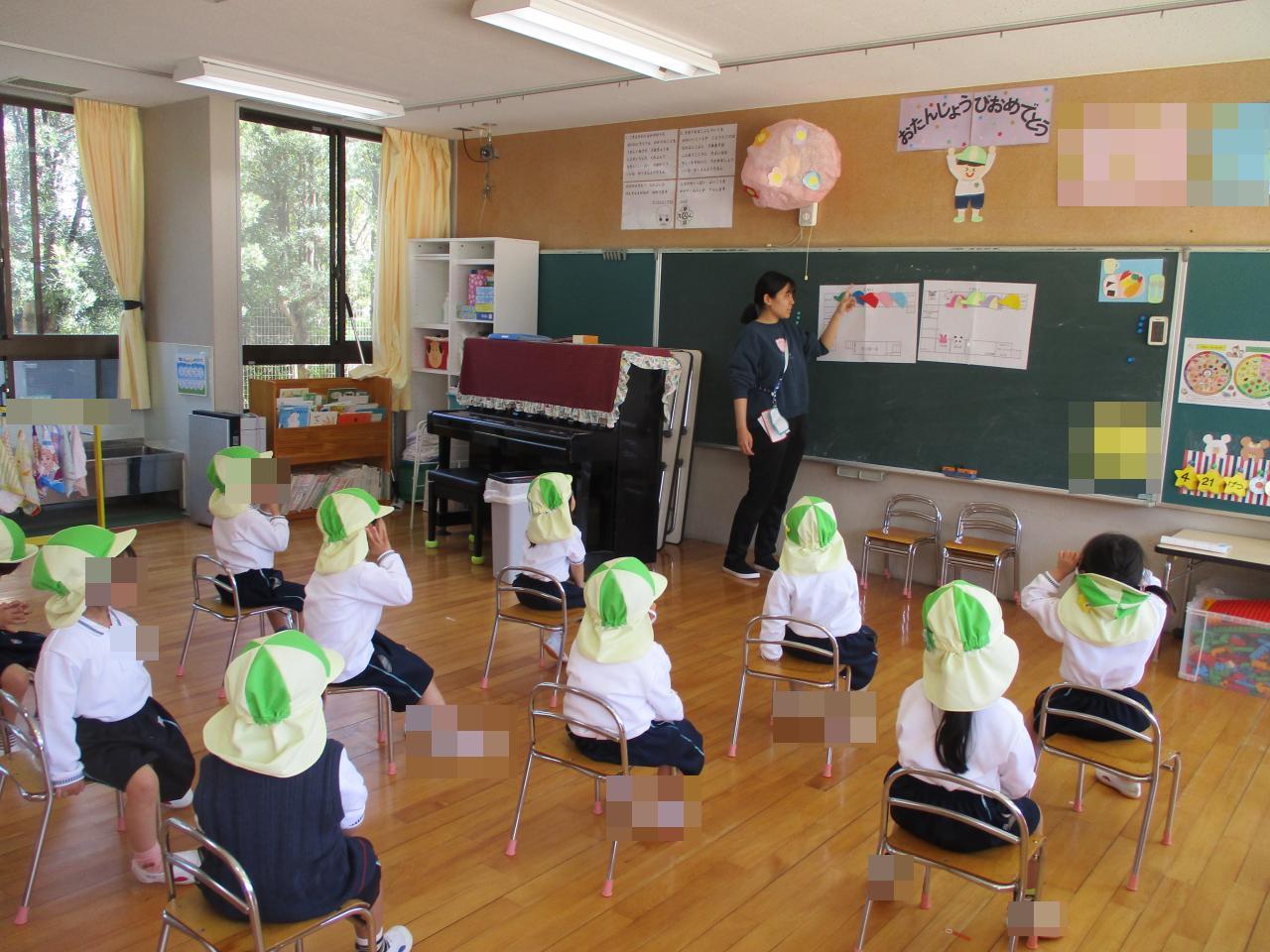 今年度初めての避難訓練は座布団の使い方や図面を使って避難経路の確認をし、来月の園庭への避難訓練に向けて子どもたちにお話しています❗