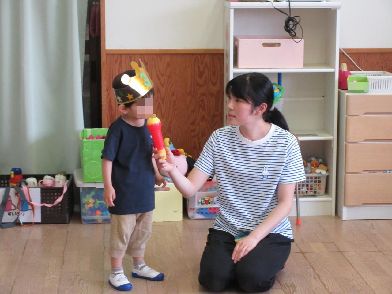 お友達の誕生日をお祝いしました!誕生児のお友達も、緊張しながらもインタビューに答えることができました😋