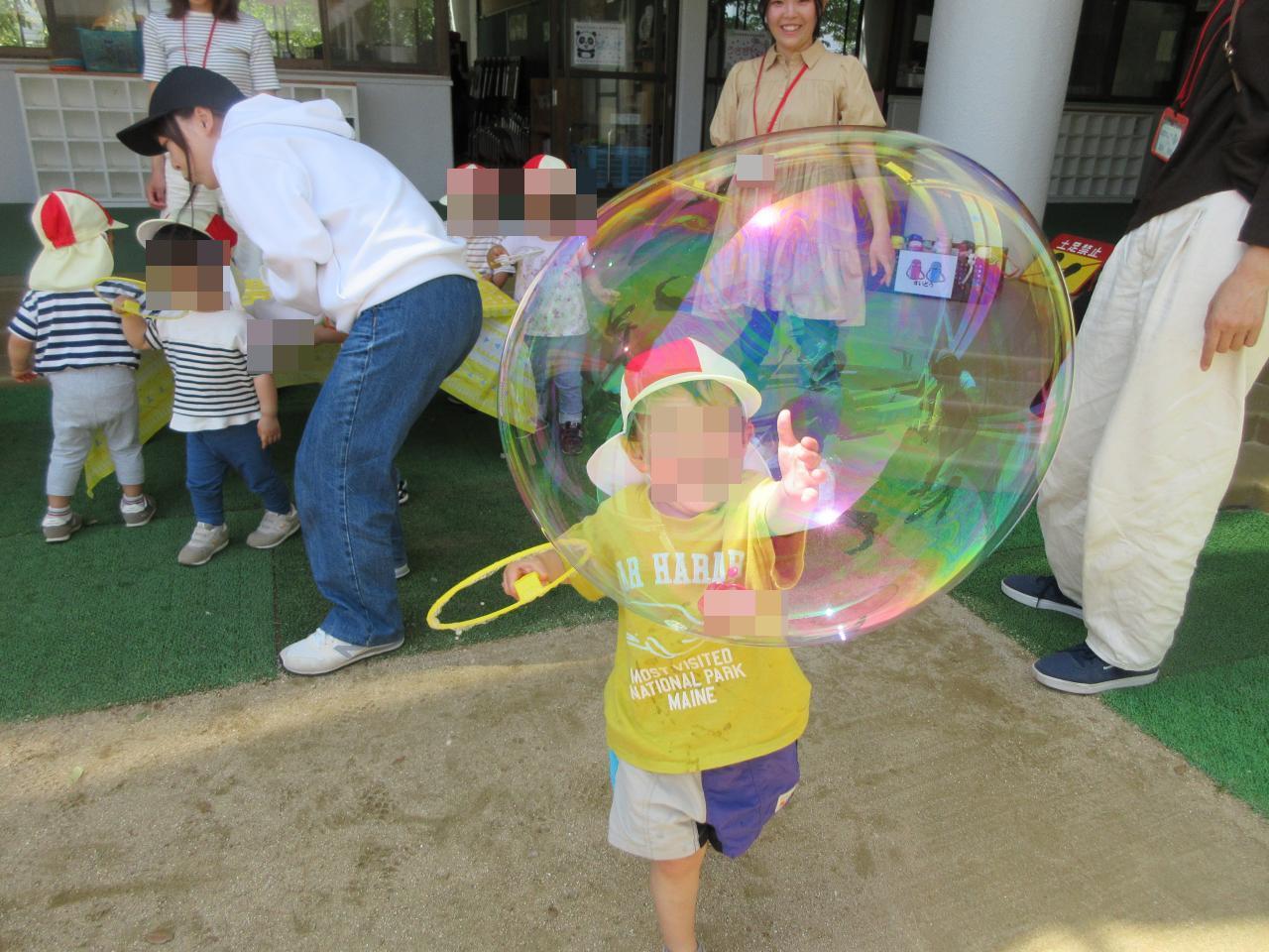 おうちの方がつくったしゃぼん玉を追いかけたり、慎重に息を吹いてしゃぼん玉をつくったり…