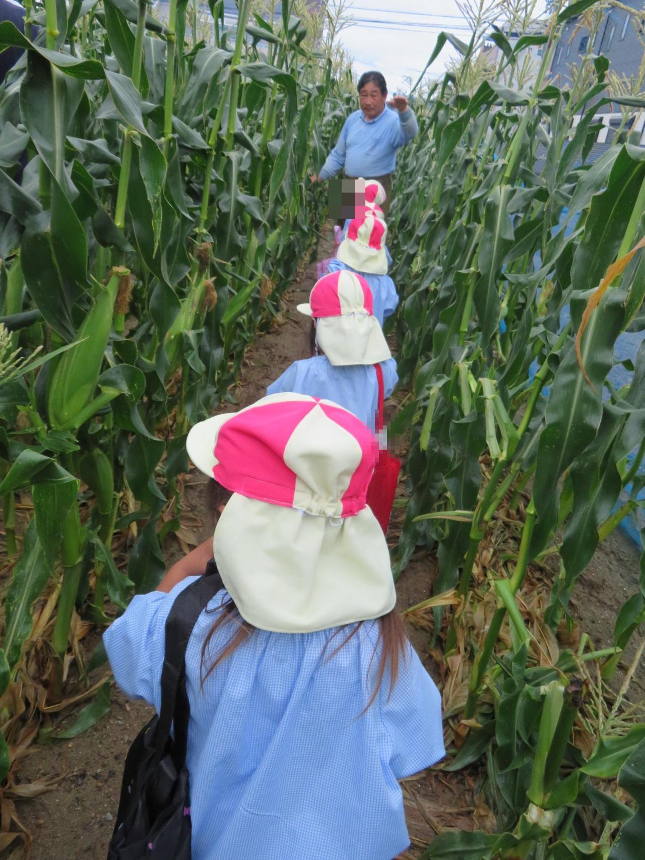畑に着くと、自分たちよりも大きなとうもろこしを見て驚く子どもたち😳