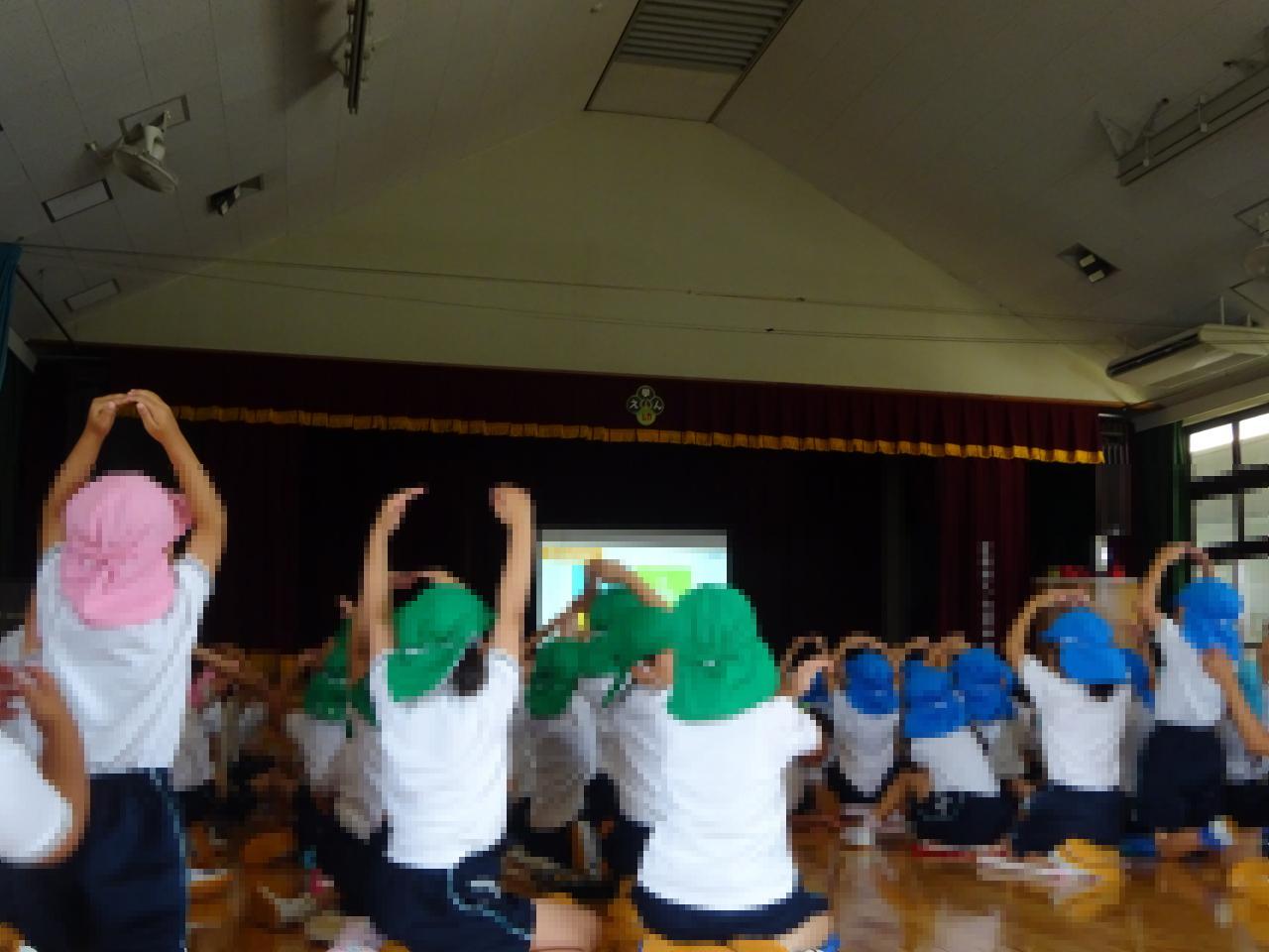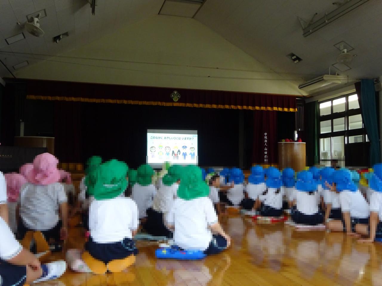 今日は全園児が大ホールに集まり防犯教室を行い、災害時による避難訓練とは異なり「防犯」という視点から命を守るための方法を学びました😌