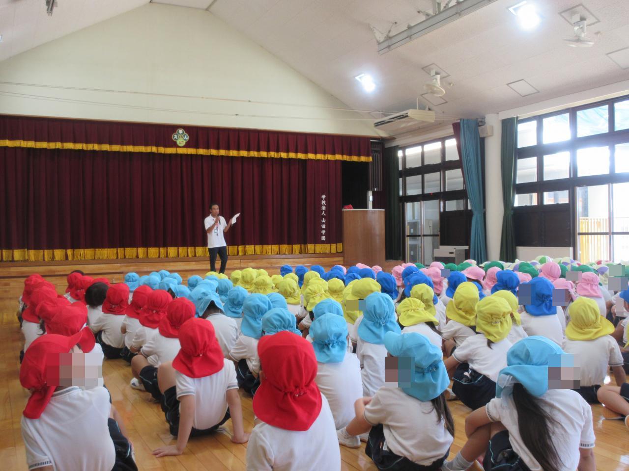 始業式では園長先生のお話を聞き、楽しい夏休みを過ごせたか思い出を振り返りながらお話を聞きました。