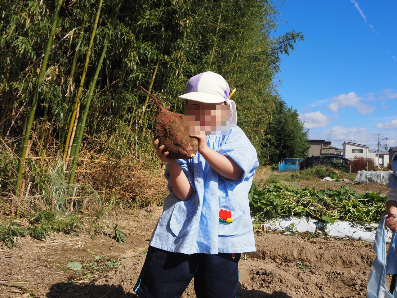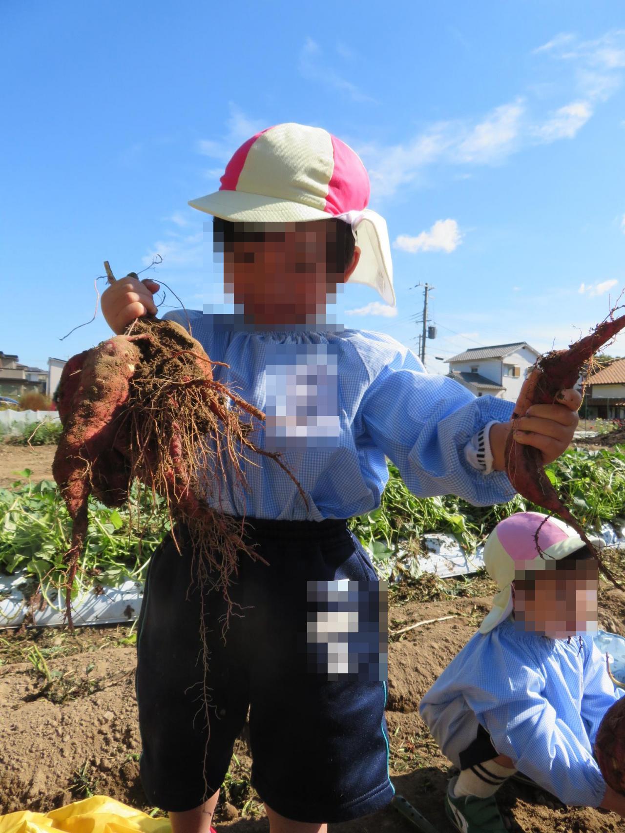 年長さん、年中さんが掘った大きなさつまいもを見て、「こんなに大きいの持てるかな~?」「お顔くらい大きいよ!」とワクワクしていた子どもたち😆