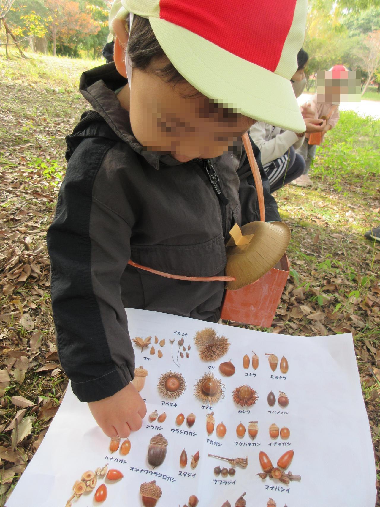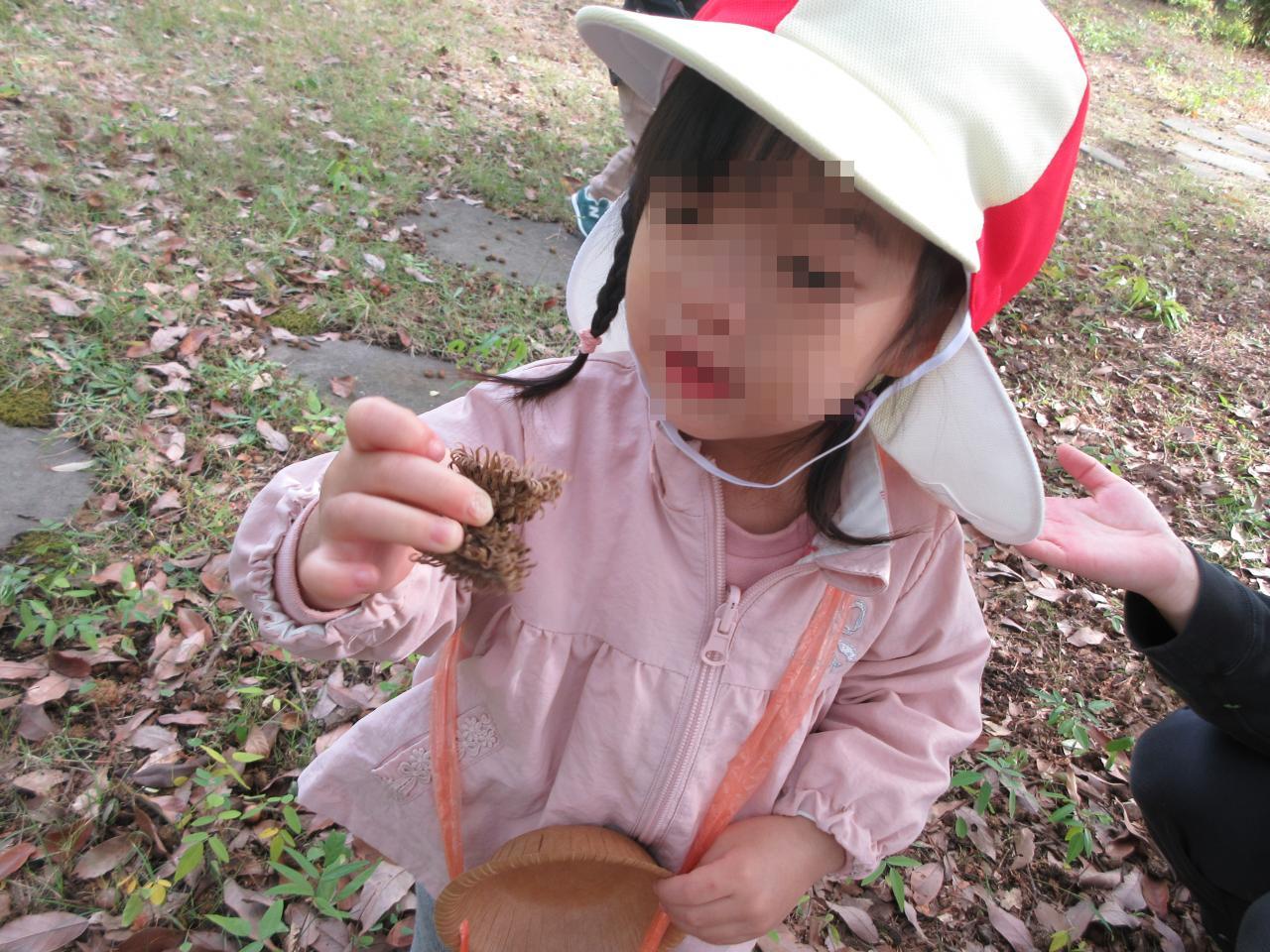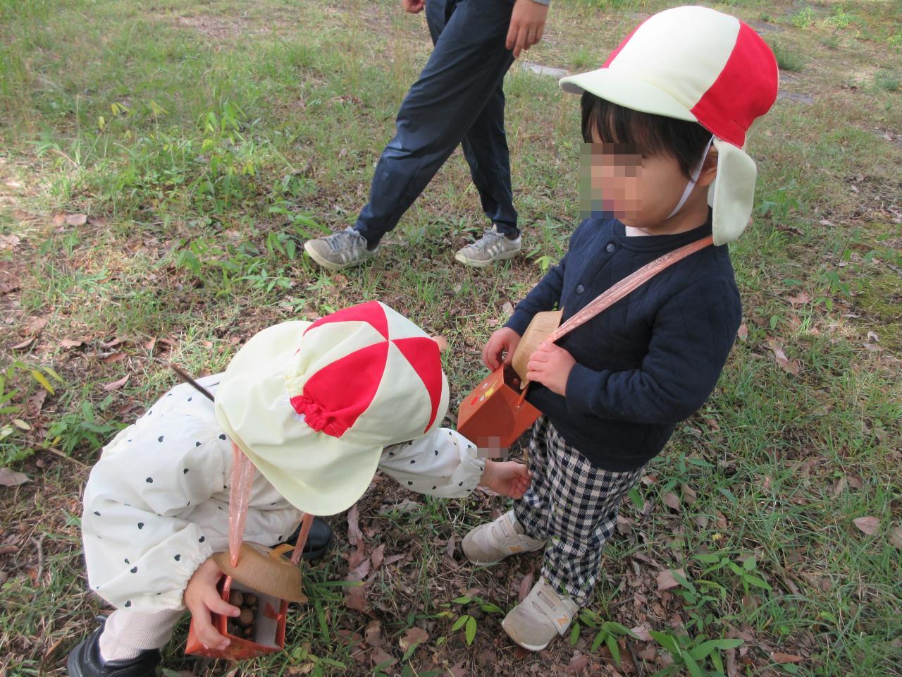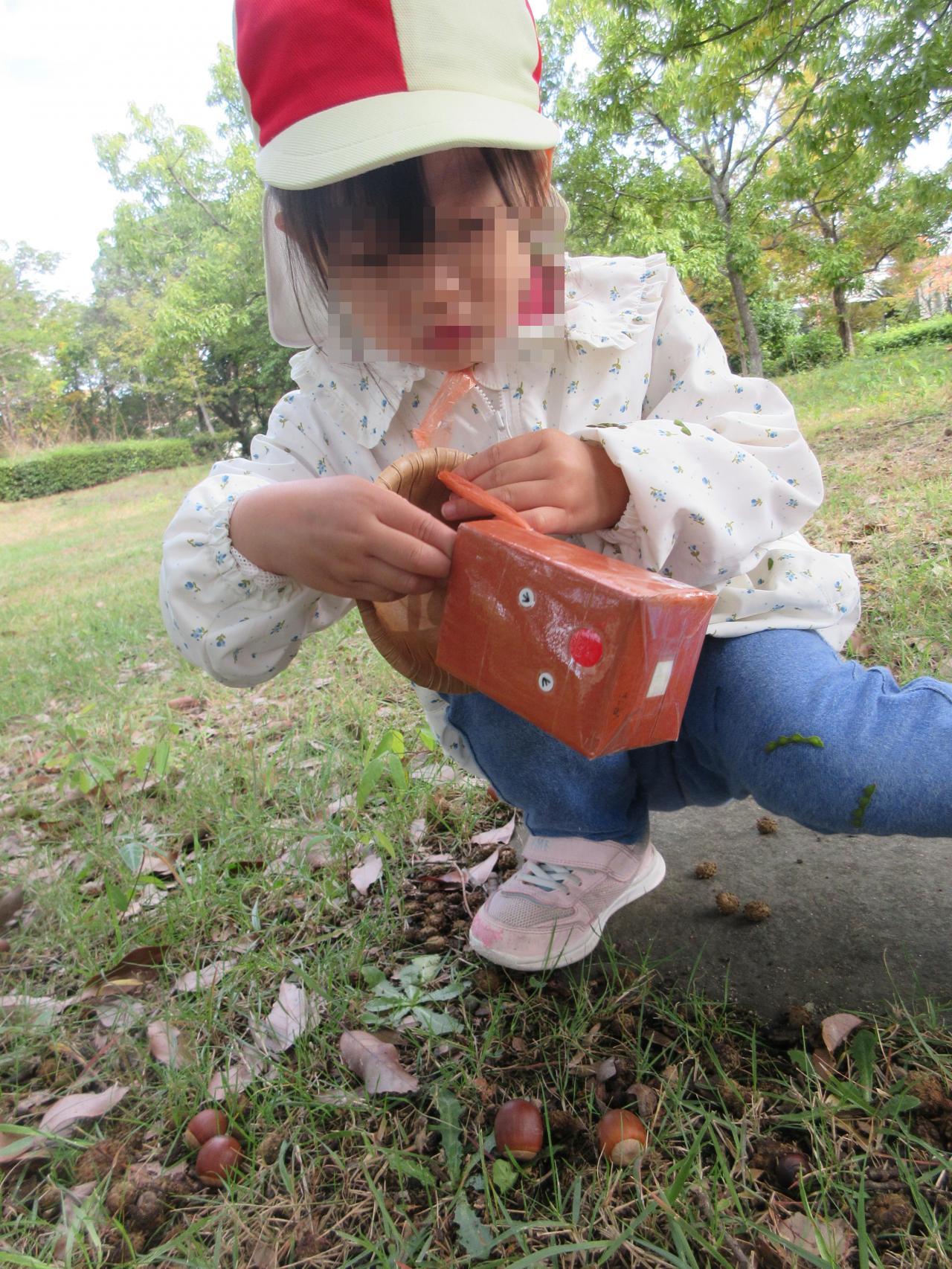 公園に到着し、どんぐりポシェットを持つとすぐに夢中で拾いはじめたどんぐりさん。
