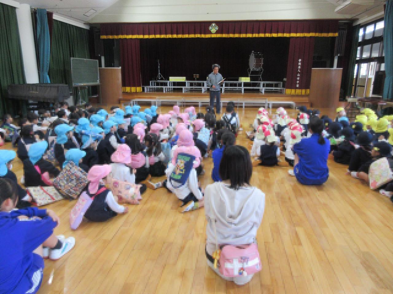 今回は地震から津波が発生したと想定し、園庭ではなく大ホールに避難しました。