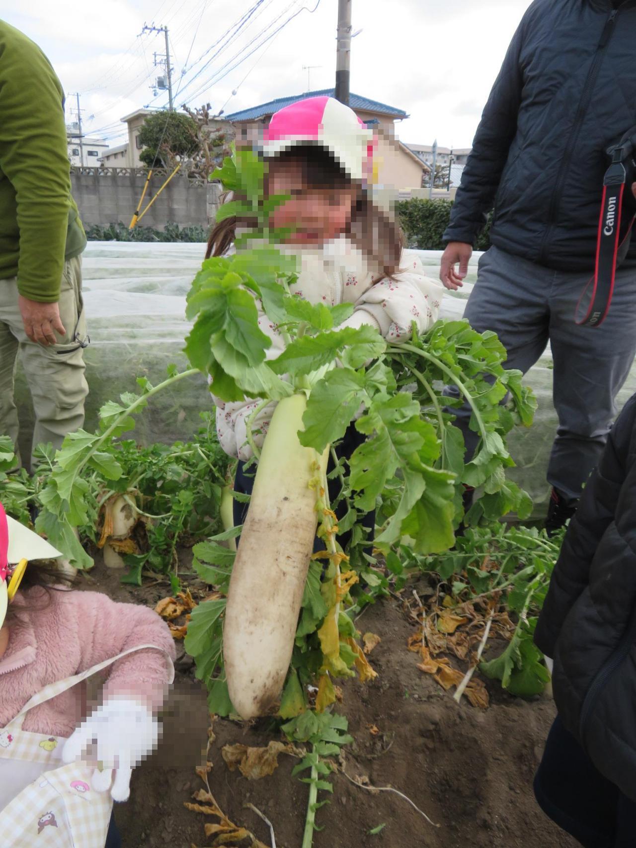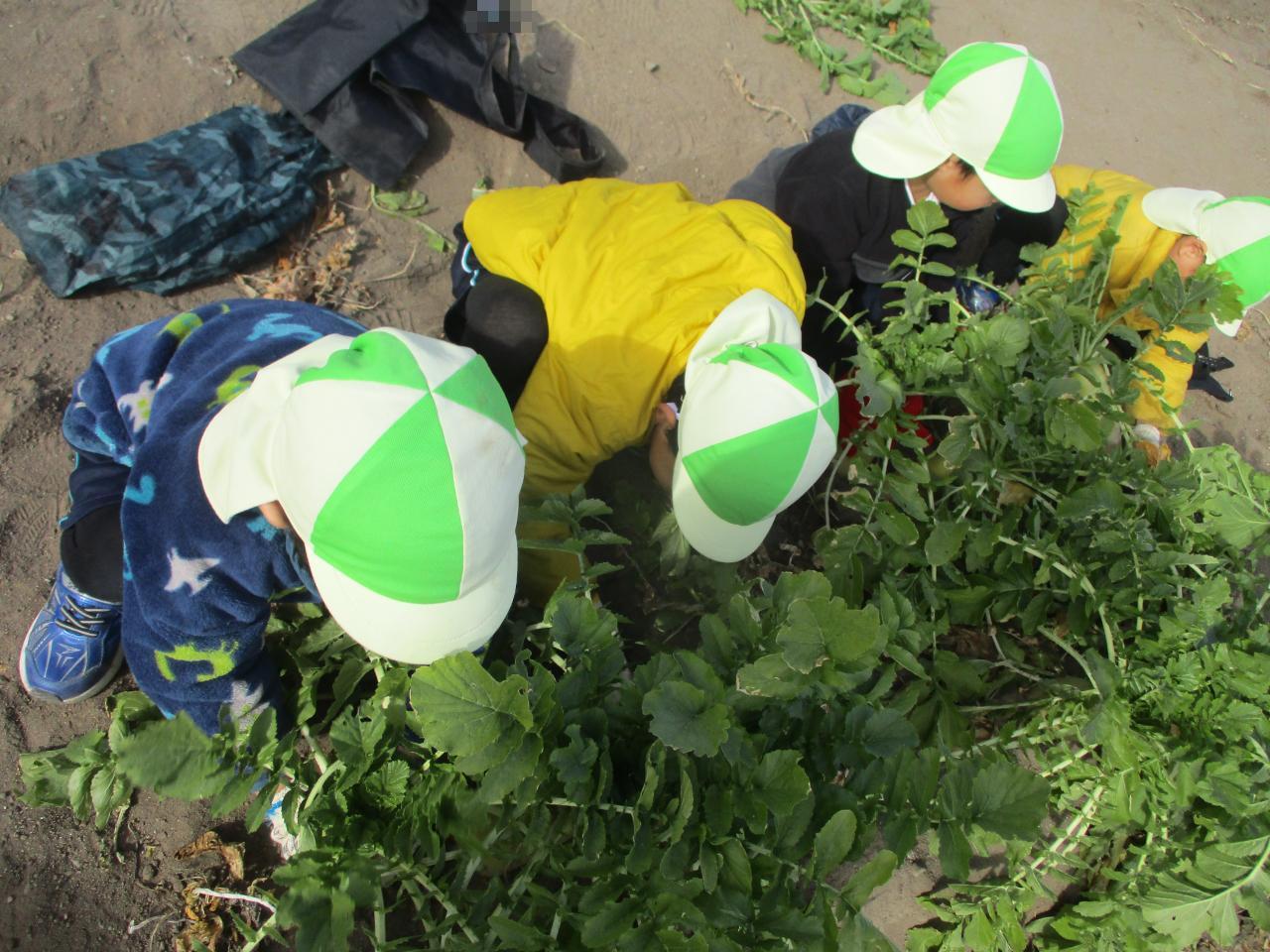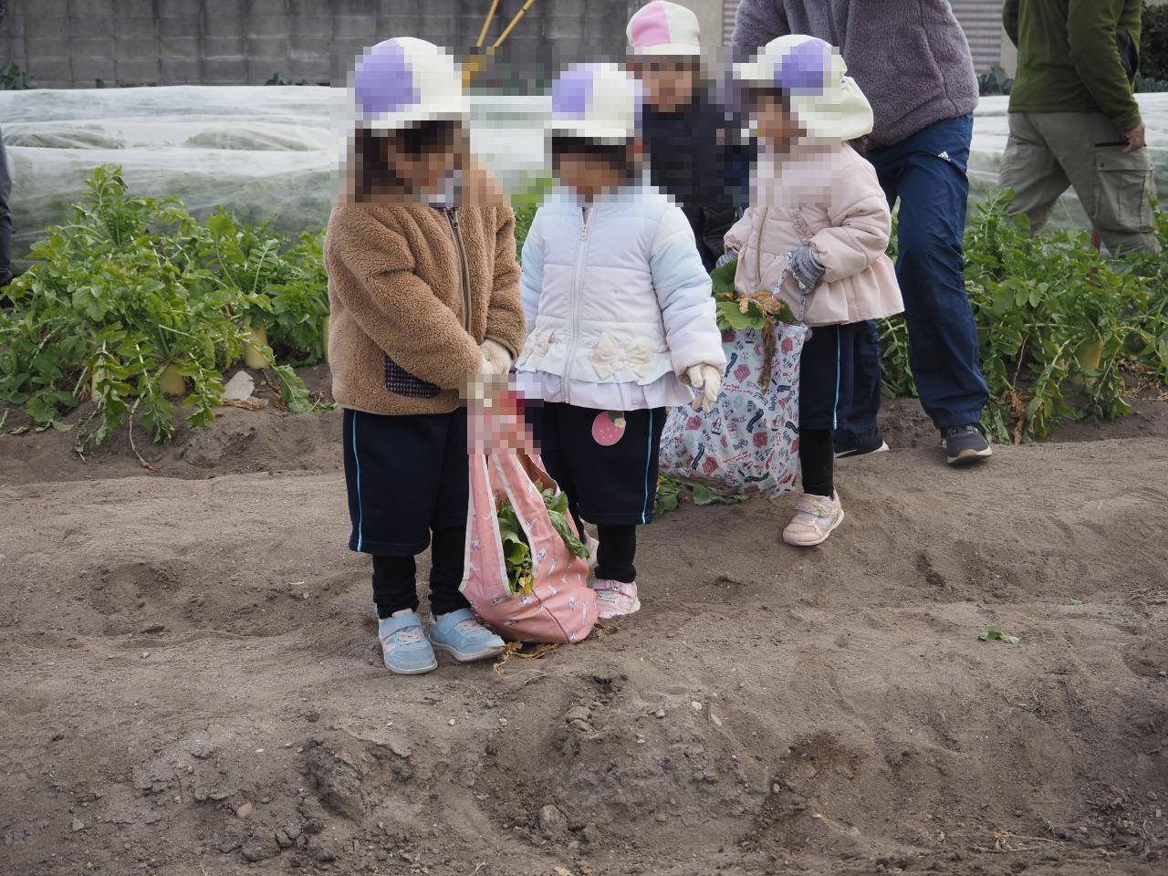 今日は年少児とどんぐりさんのお友達で大根収穫に行きました!