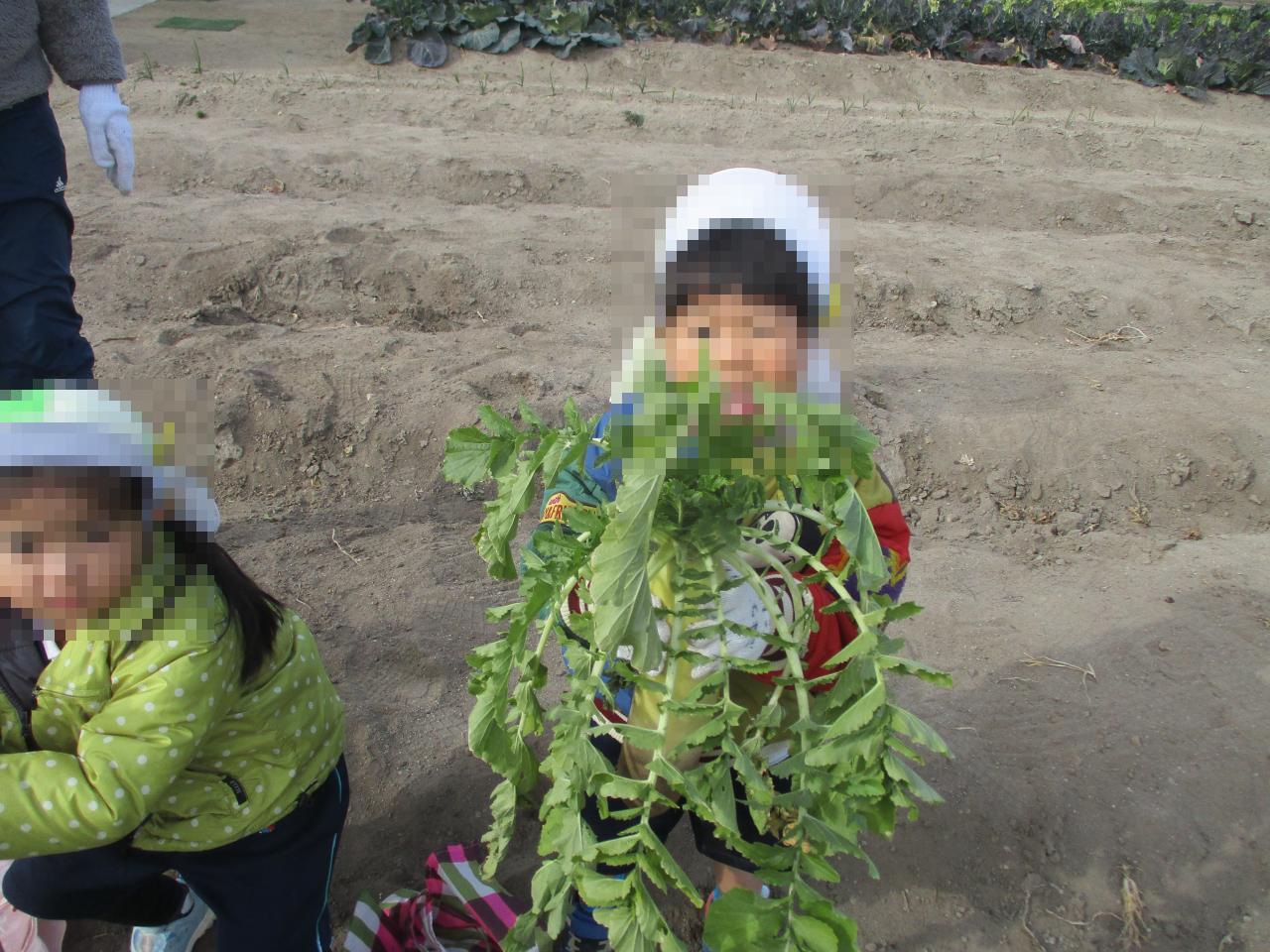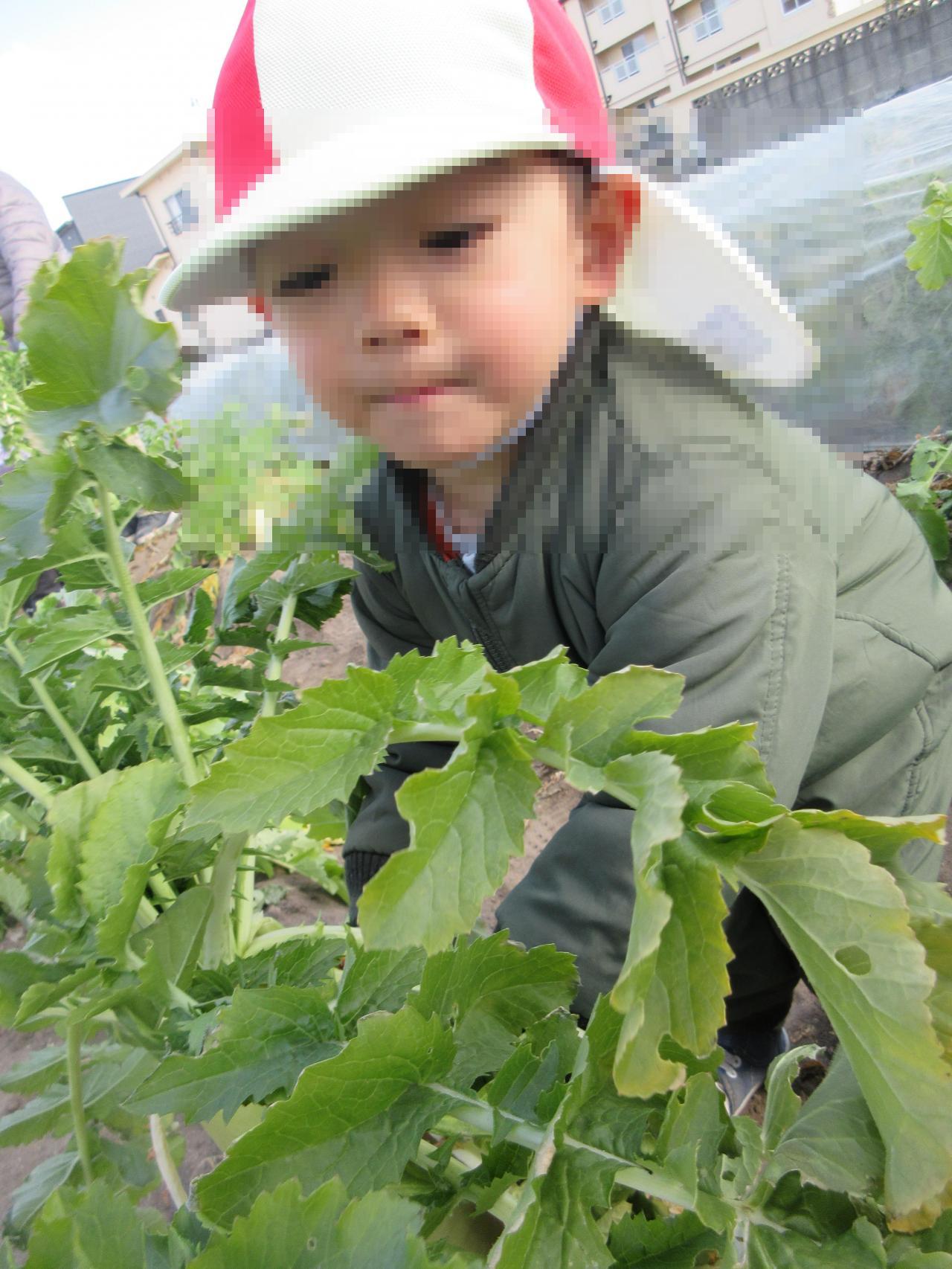 沢山の葉をかき分けながら、大きな大根を探して力いっぱい自分の力で抜く姿が見られました😄