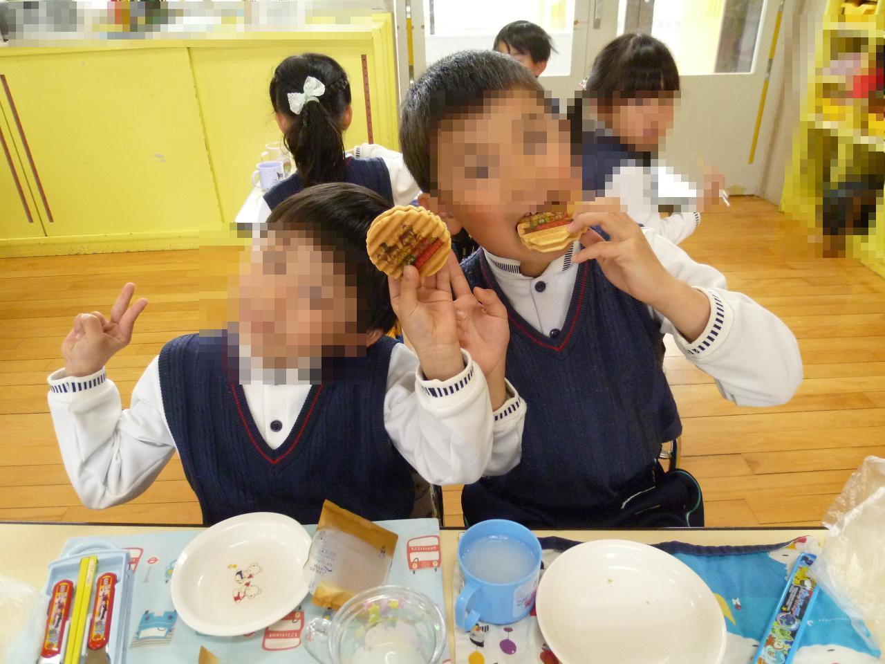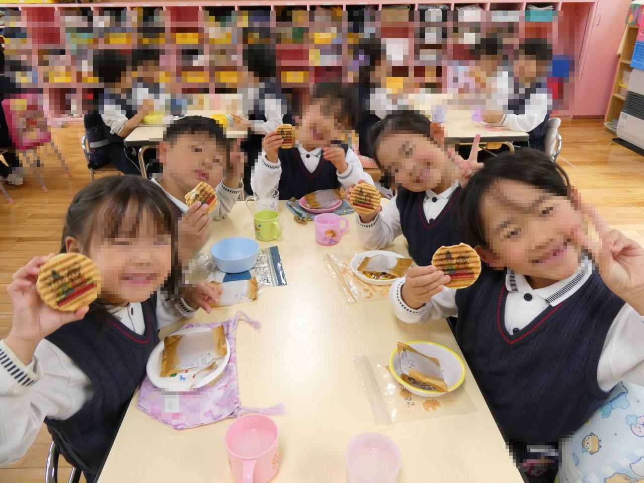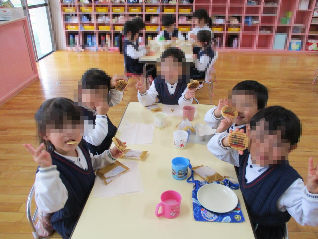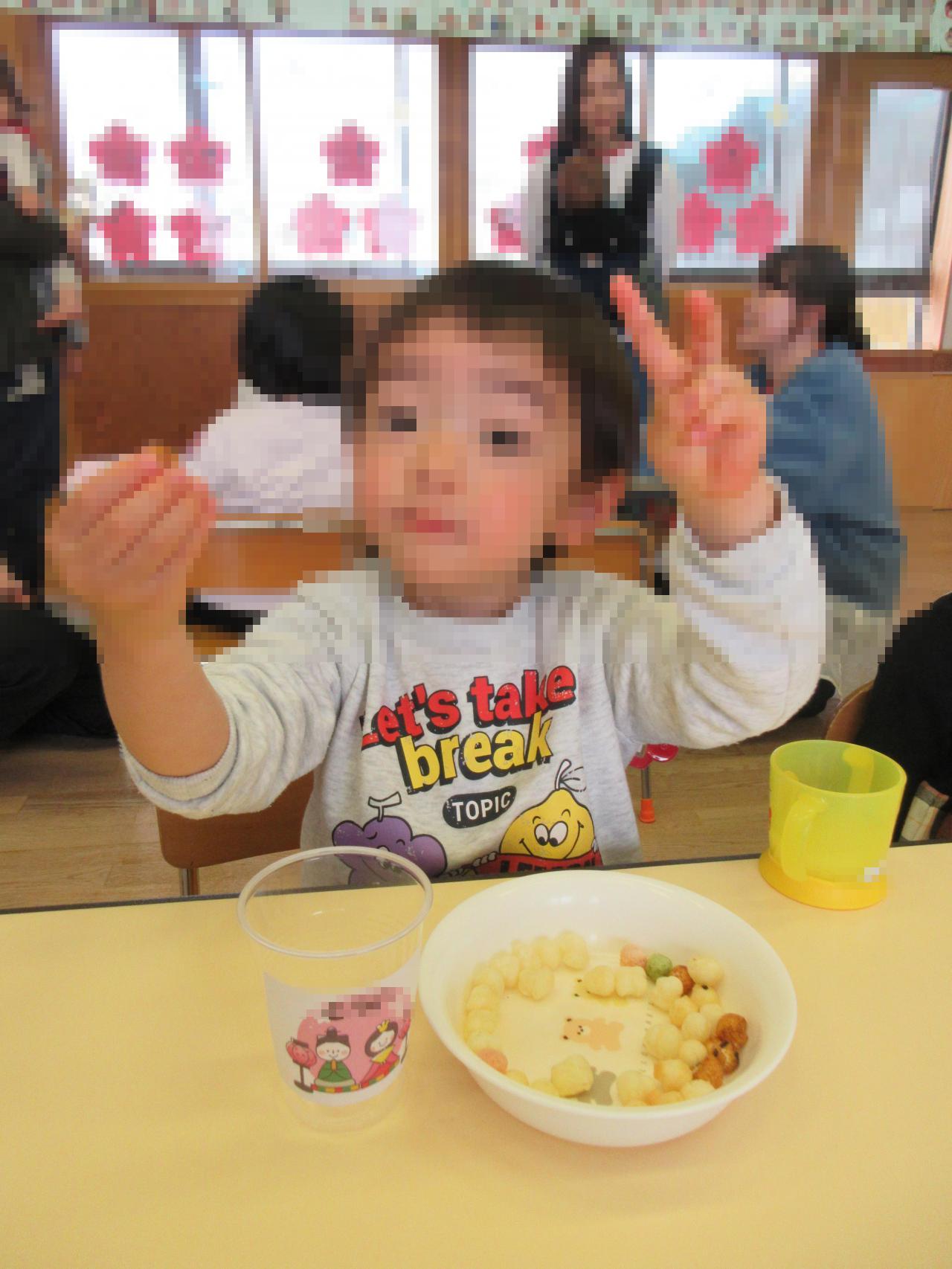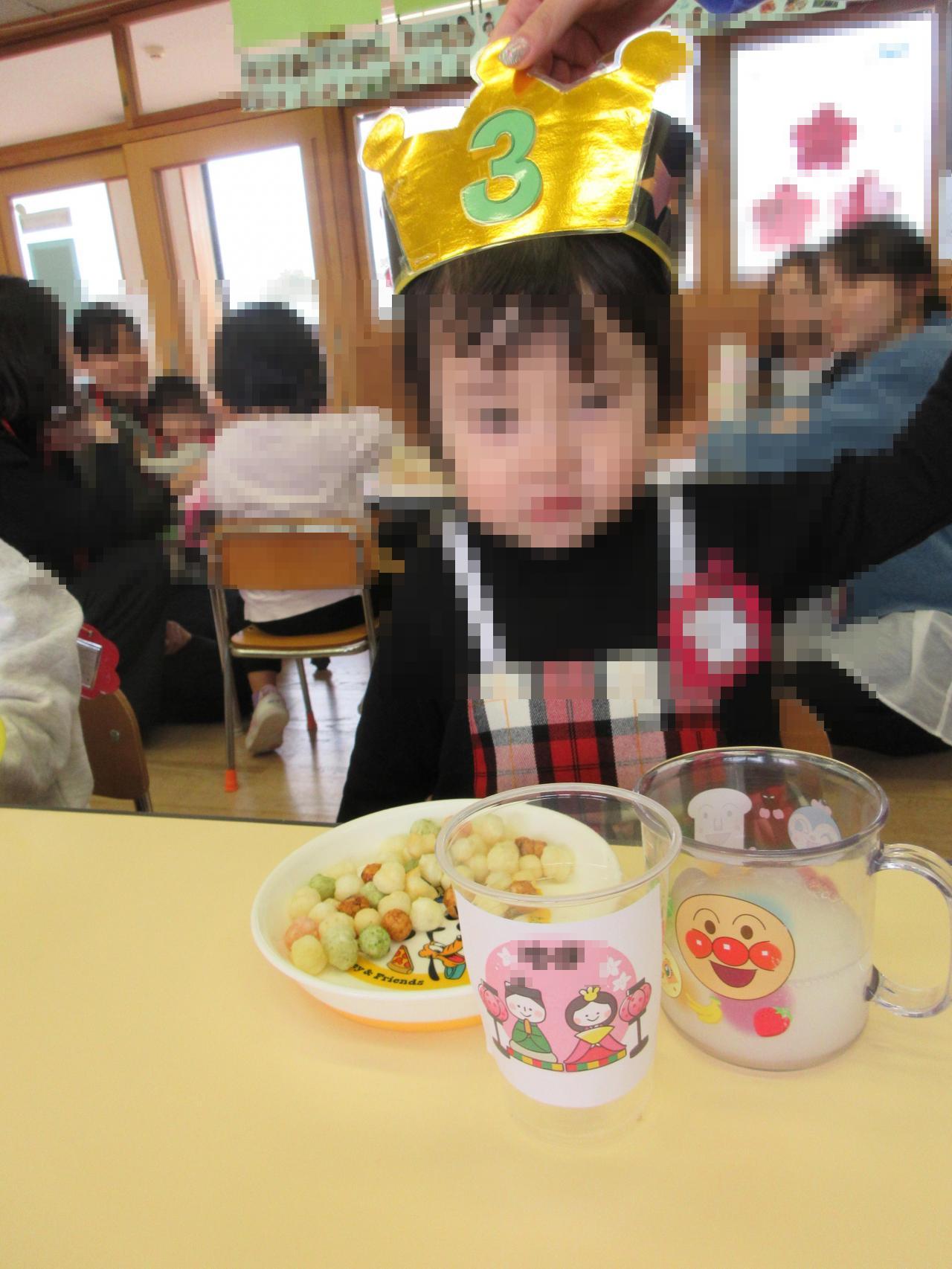 お部屋ではひなまつりのお祝いでカルピスと保護者の会よりがっくんの絵柄のついたおせんべいを頂きました😆