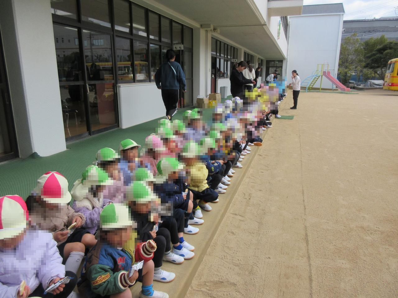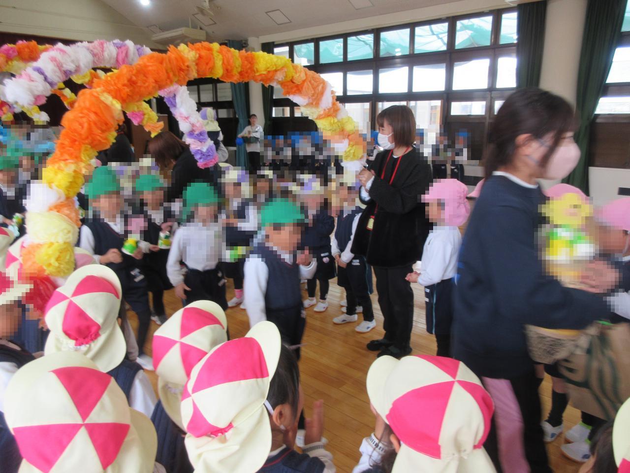 最後はお花のアーチで年長さんを送り出し、お外で保護者の会より頂いた、アンパンマンジュースとおにぎりせんべいを食べました😋