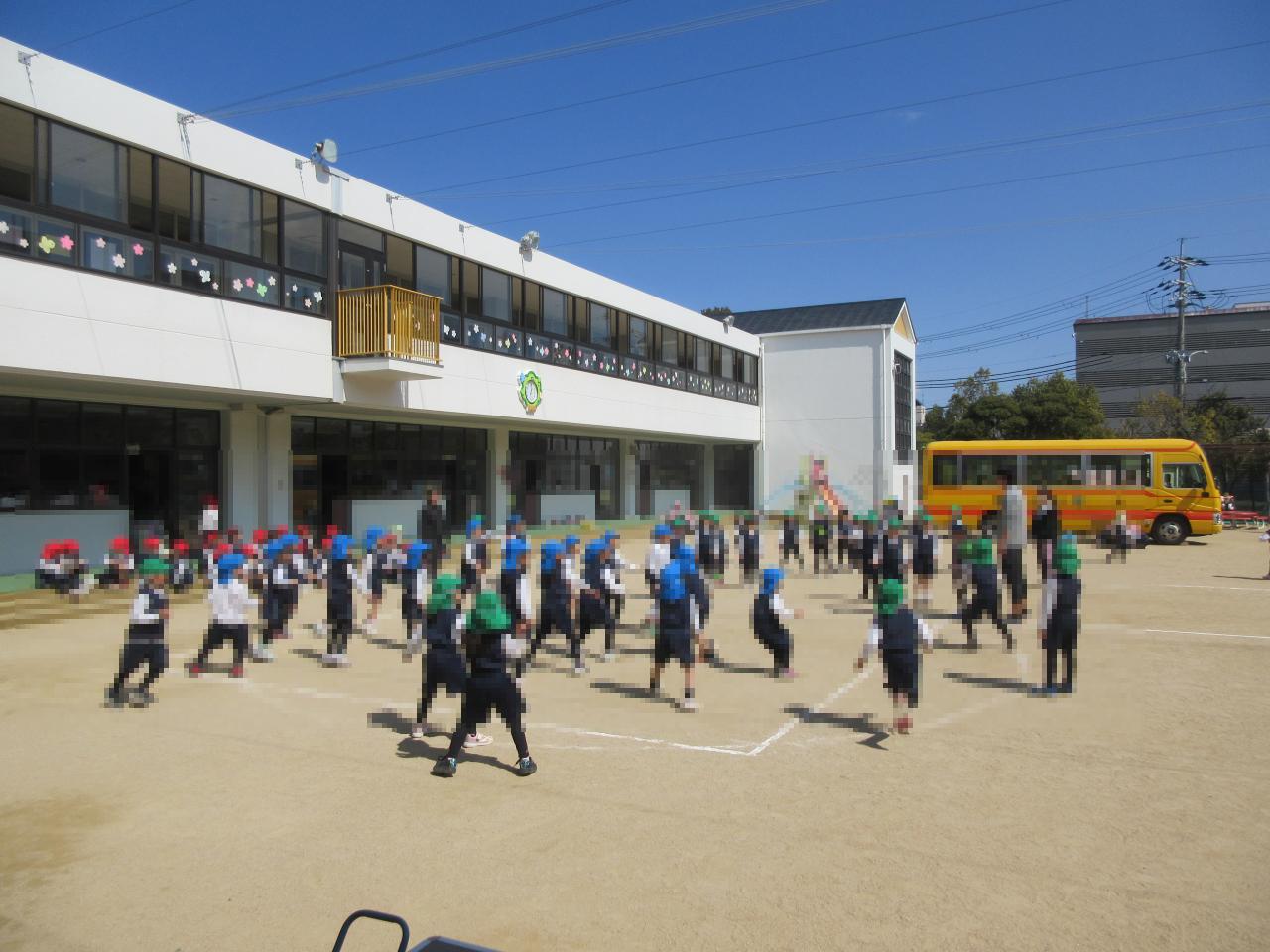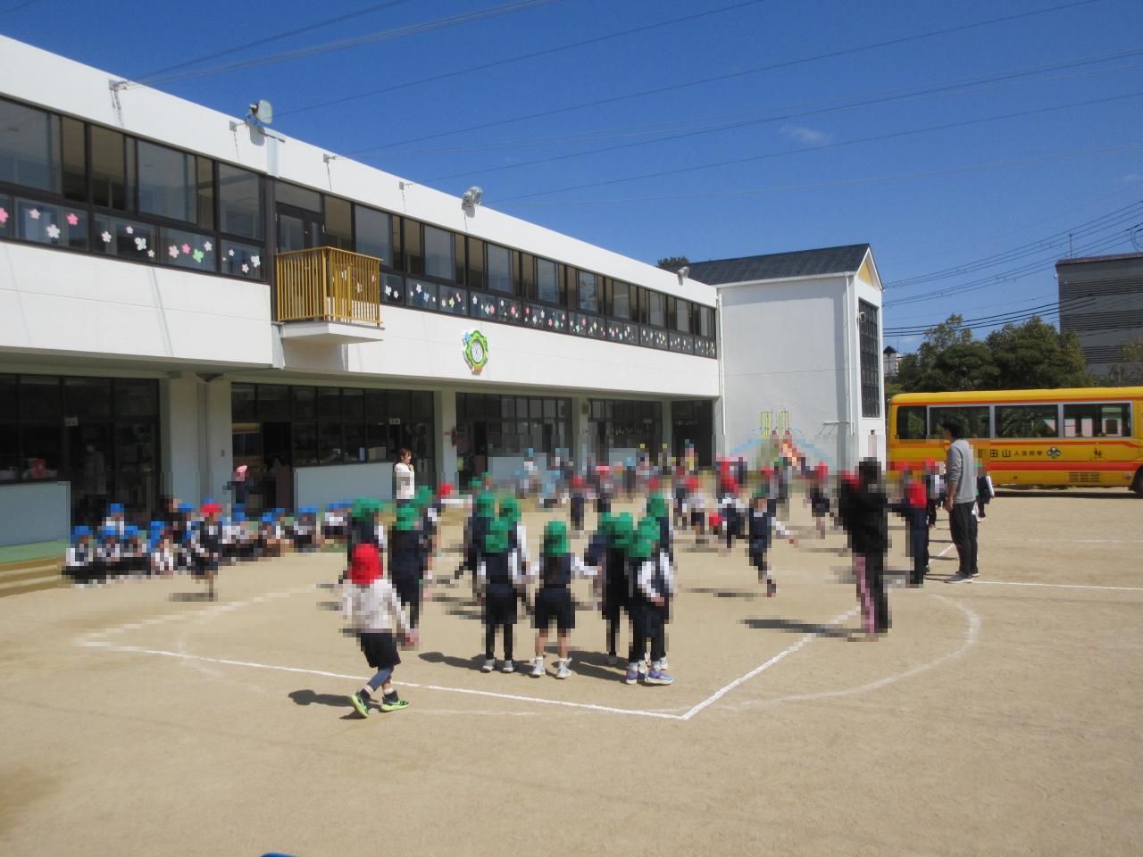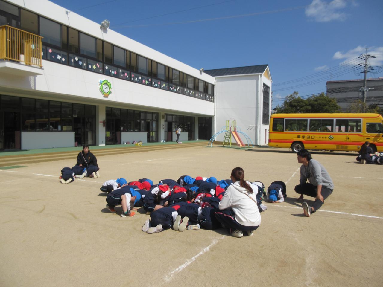 子どもたちは外遊びをしている時間帯で園庭にいました。どこにいても落ち着いて先生のもとに集まることができましたね✨