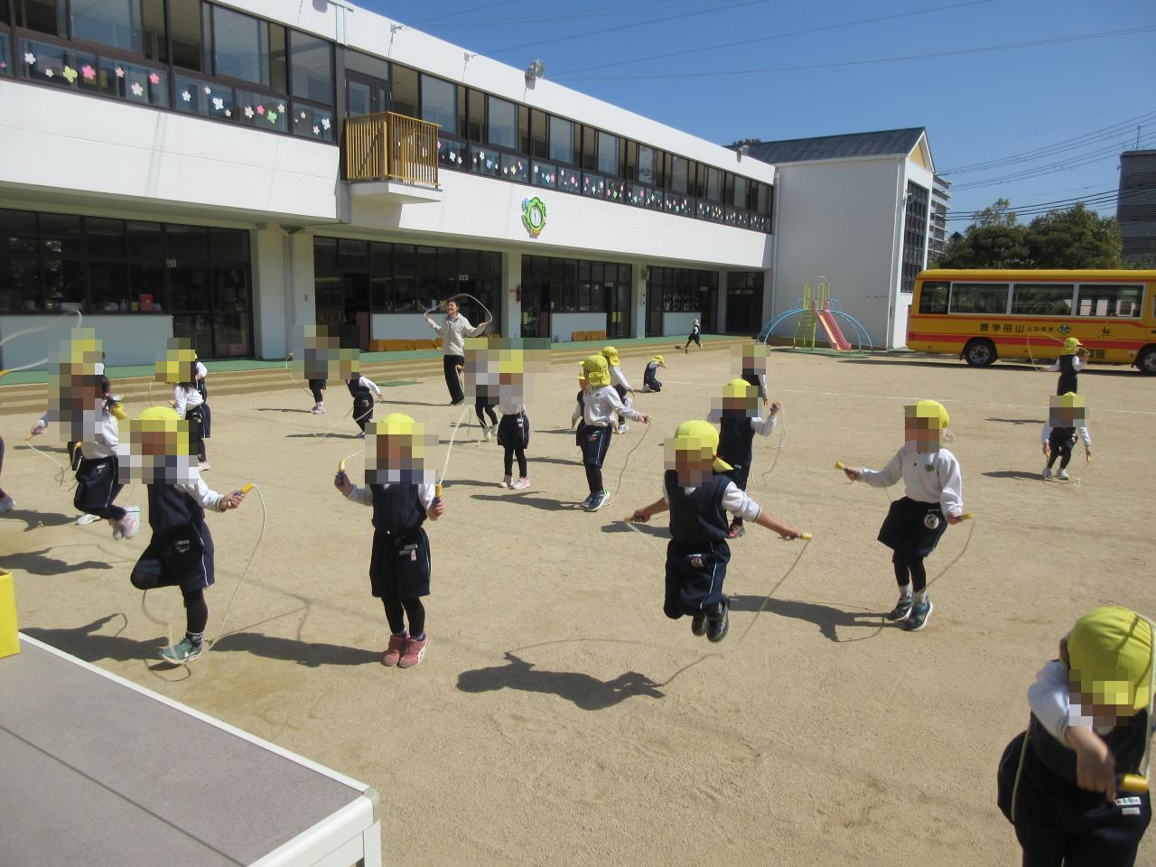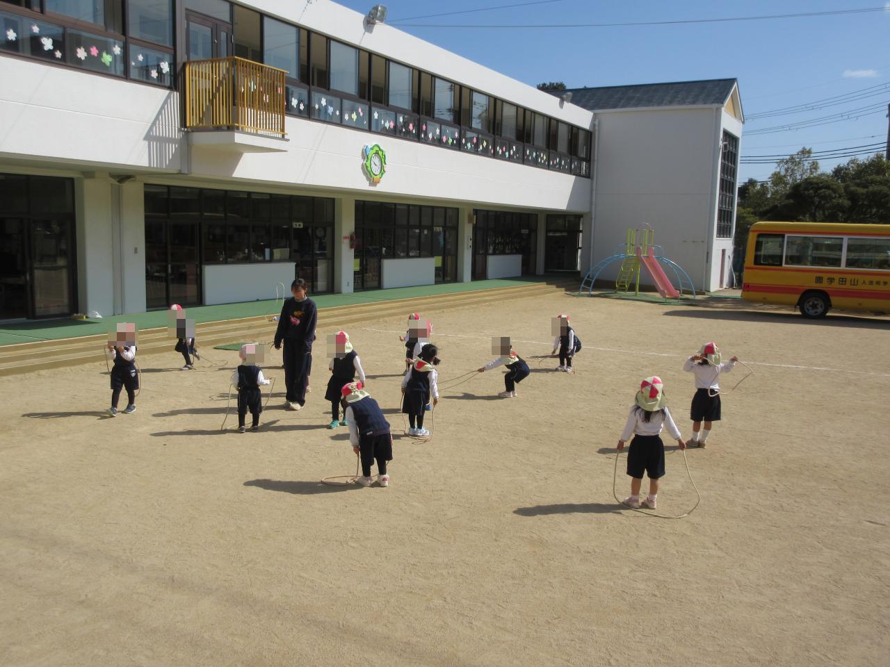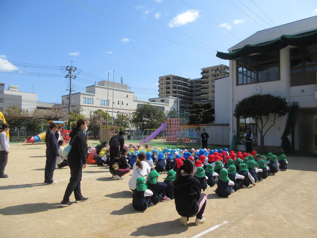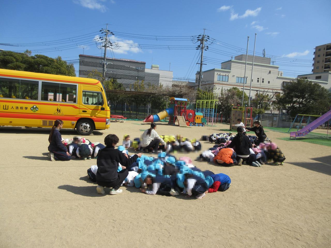 子どもたちは外遊びをしている時間帯で園庭にいました。どこにいても落ち着いて先生のもとに集まることができましたね✨