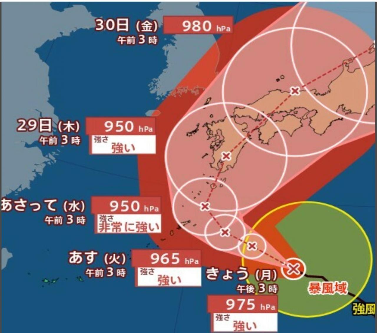 今朝6時の気象庁の予想では、強い勢力を保ったまま28日から29日にかけてのタイミングで九州の南部に上陸し、そこから偏西風の影響で速度が上がり、29日から30日にかけて四国(愛媛)・中国地方(広島)→31日には日本海側へと一気に進むということです。