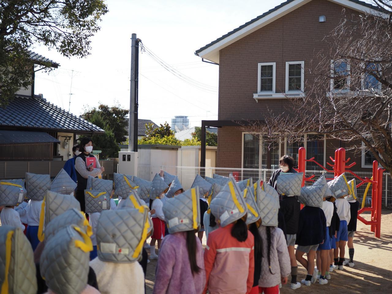 園内で地震発生の放送が鳴ったことに驚く子どももいましたが、しっかり職員の話を聞いて、体を守る”だんごむし”のポーズになり、防災頭巾をかぶって園庭に避難することができました👏