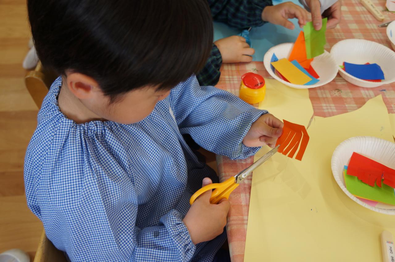 折り紙にハサミで切れ目を入れて…うろこを作りました。