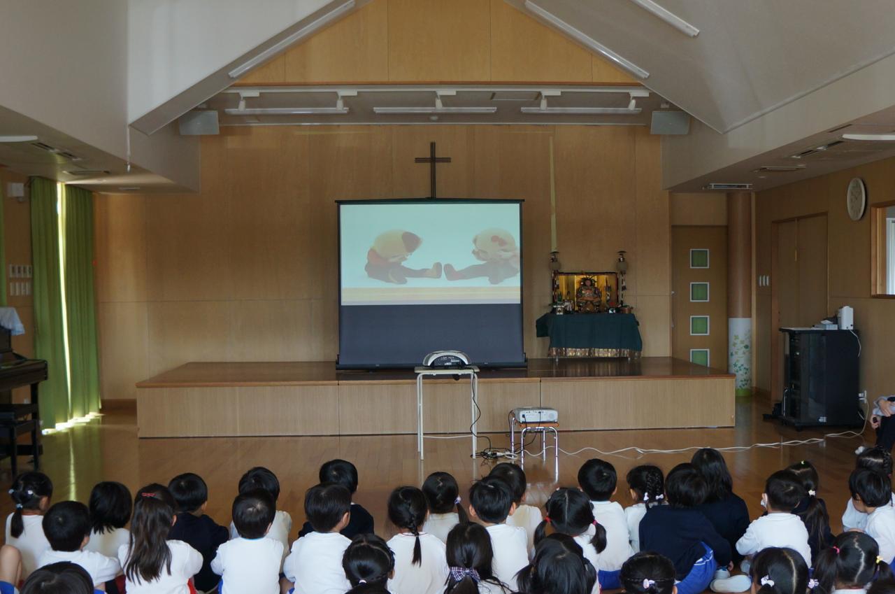 今日は幼稚園で安全に過ごすためのDVDをみんなで見ました。