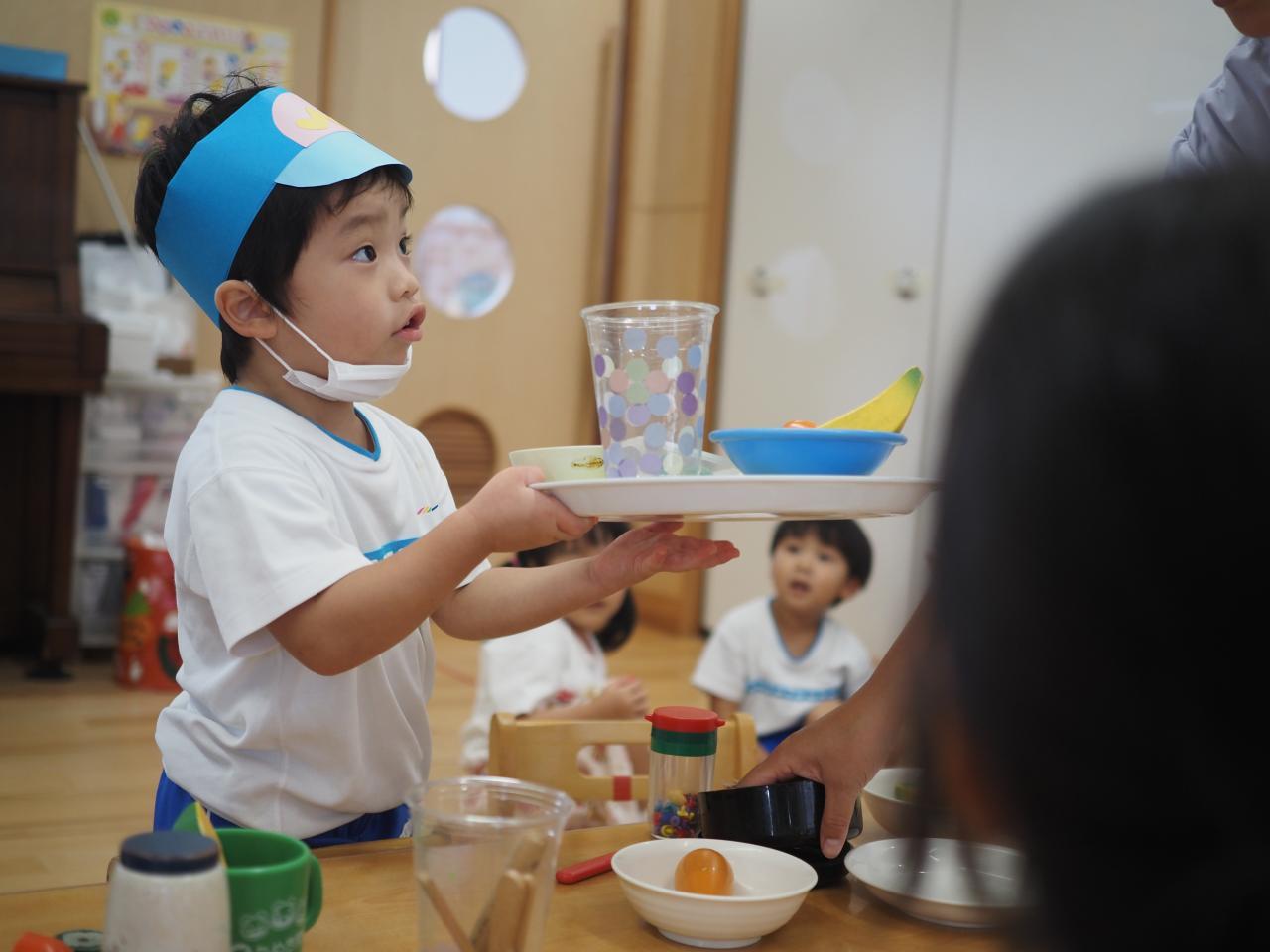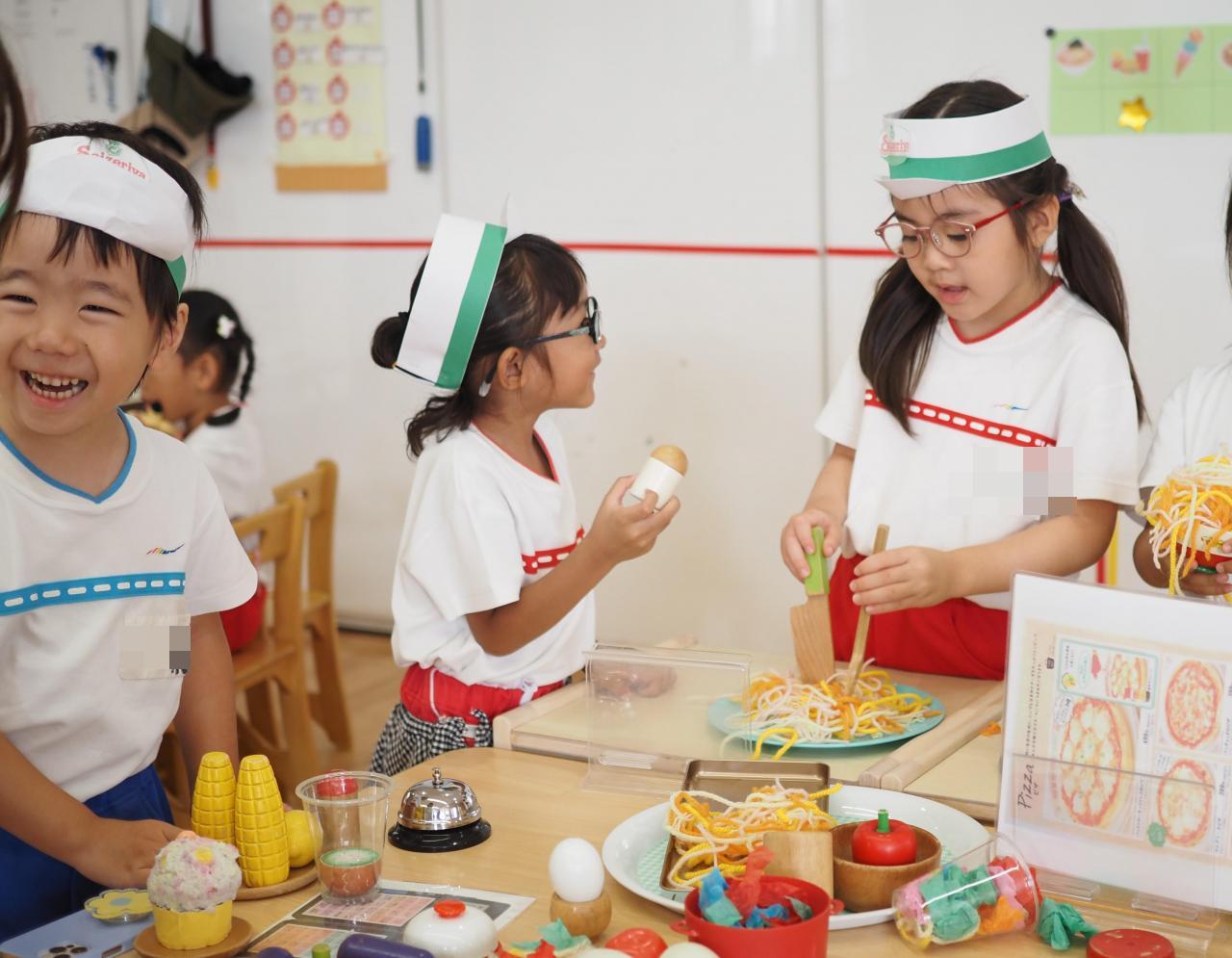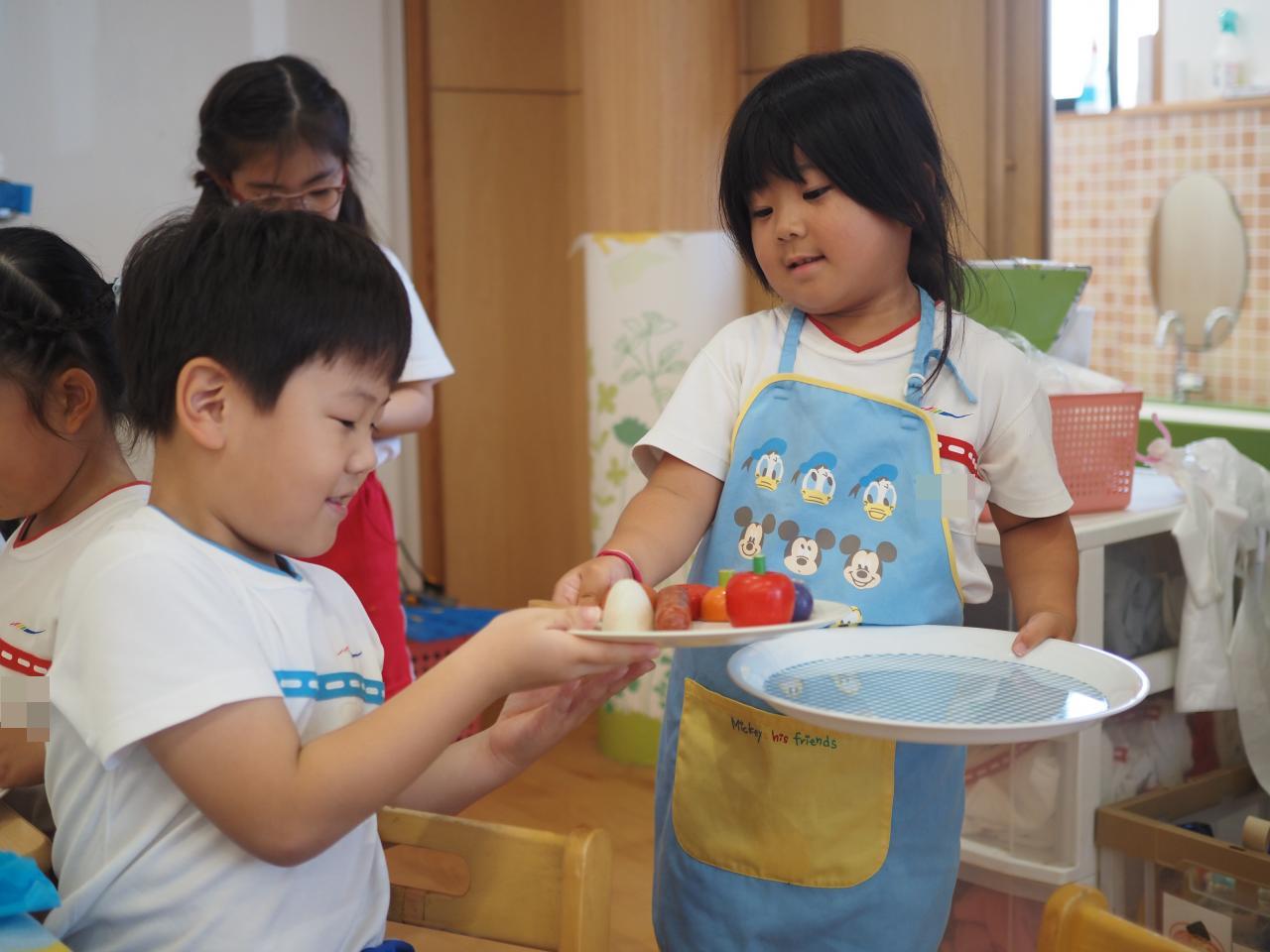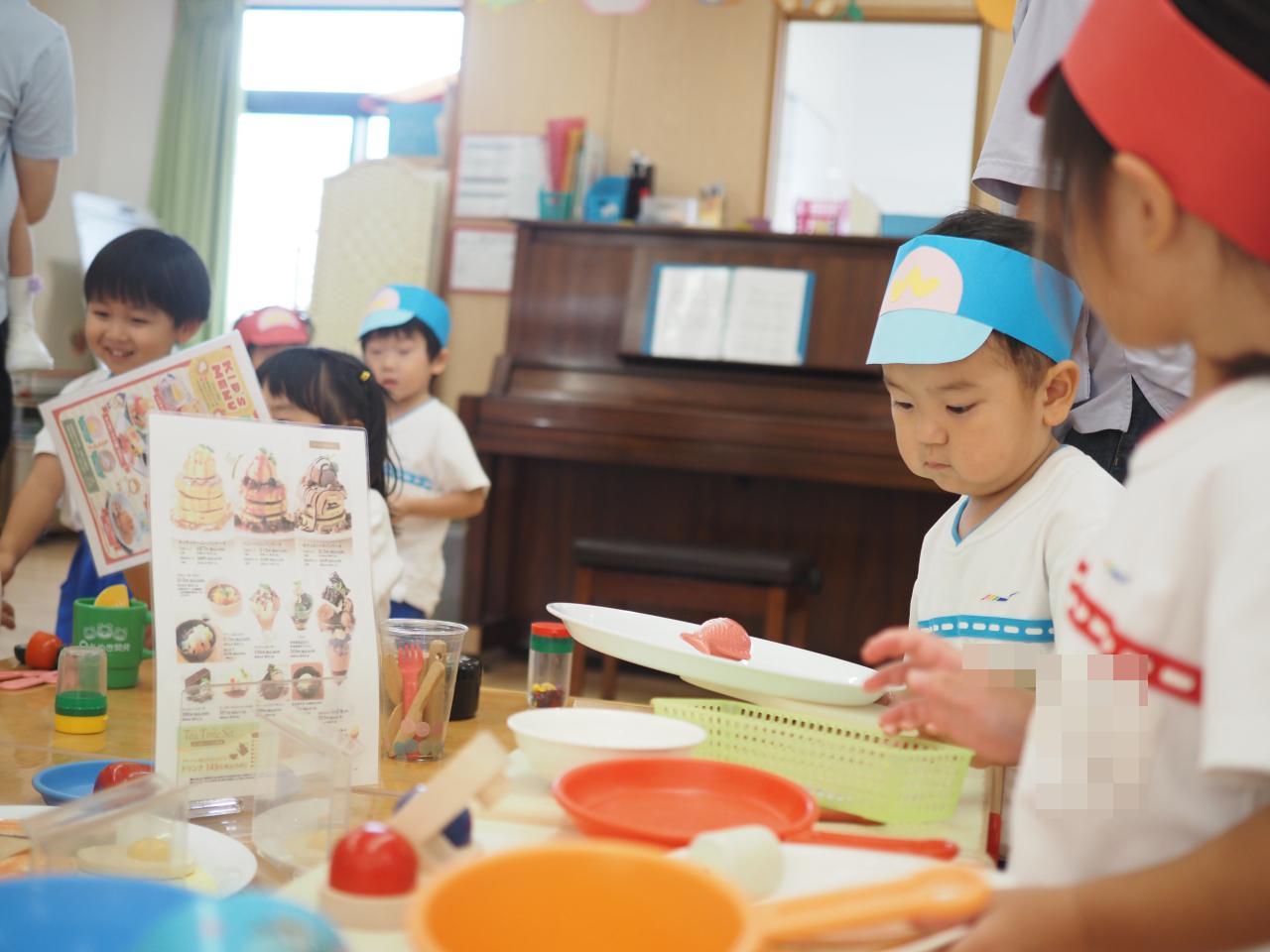 ひまわり組さんも含め、違うクラスのお友だちがお客さんになって来てくれ、注文したり、お料理を届けたりとクラスが違うお友だちとも交流して遊ぶ様子がとてもかわいかったです!