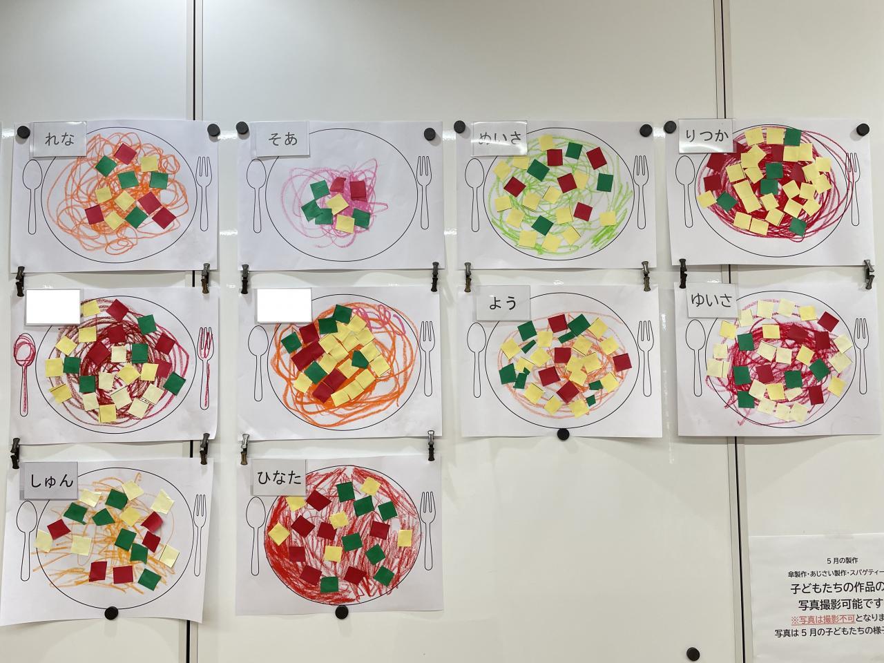 スパゲッティは自分の好きなスパゲッティを描きました。虹色・バジル・たらこ・ミートソーススパゲッティ、そしてナポリタン!お皿からこぼれないよう気をつけながらクレパスで描いています🍝